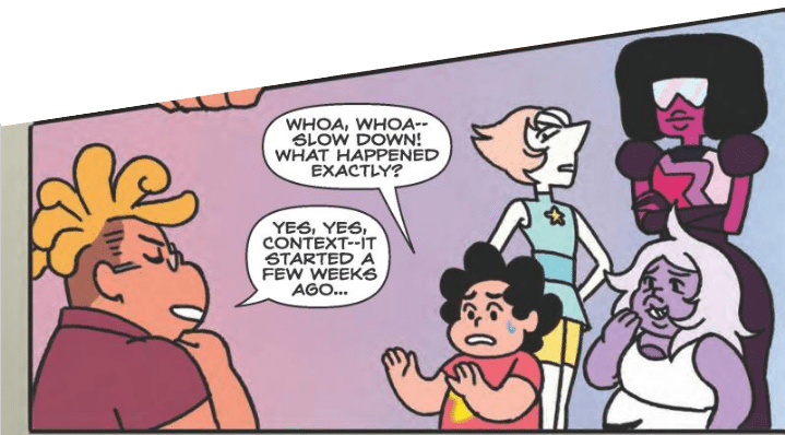 In a lot of ways, Anti-Gravity plays out like almost any episode of the show. The book opens on a carefree afternoon in Beach City Steven is teaching Amethyst how to flip pancakes while Pearl cleans in her unnecessarily graceful fashion and Garnet chills on the sofa when suddenly things begin to get a little weird. The pancakes start floating in midair, and then Ronaldo, resident conspiracy theorist and part time fry cook, arrives, banging frantically on the door and screaming about aliens. The show’s sense of humor carries over too, especially in silly gags like when Garnet, upon hearing Ronaldo’s proclamation of “Aliens!”, wordlessly proceeds to slam the door in his face.