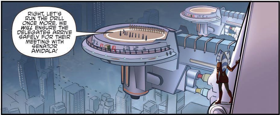 Even the supposedly sprawling panels—the vast interiors of Amidala’s quarters, the landing platform overlooking Coruscant, the main hall with towering pillars—have the bare minimum of details. The art in this issue is functional at best, and certainly does the job of conveying the story, but everything looks so incredibly rushed.