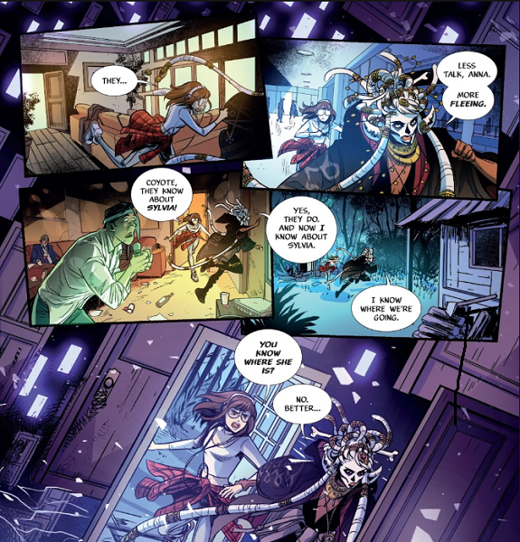 Eleonora Carlini’s artwork, which marries the magical and the mundane, combined with Silvia Tildei’s pulsating colors and Marshall Dillon’s letters, bring Backways to life. Carlini jumps Anna and Coyote Bones from setting to setting in small, fast-paced panels, perfectly communicating how the Backways themselves interweave with the ordinary world. Tildei infuses each page with brightness, playing up the contrast of shadows and neon lights. Coyote Bones battles the Mourning Wolf bathed in bright yellow, while Anna struggles with the dead in shades of gray underlit in blue. The contrasted colors allow the reader to follow the story’s flow smoothly through illustrated chaos. Visually, their work pleases the eye.