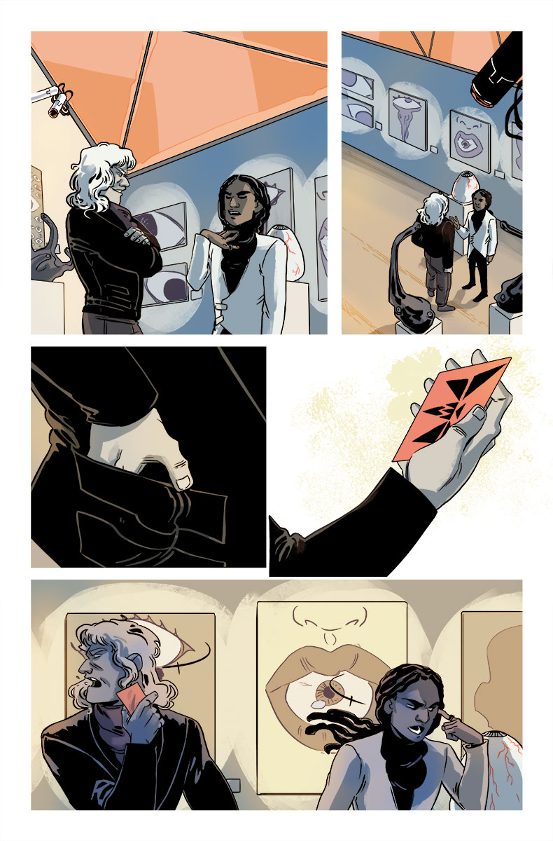 I pushed myself to make sure that when they’re interacting with someone, their body language keeps pretty close to the disguise they’re wearing. I wanted to subtly tell the reader that Niki is a very skilled actor. I think issue two actually has the clearest example of that—I’m excited for people to read it.