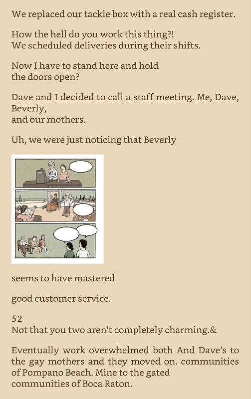 Additionally, Lenovitz separates the text from his thought bubbles, speech balloons, and text boxes. The captions are typed below or alongside each illustration. Since the illustrations supplement the text rather than tell the whole story, this design choice works well. Readers don’t have to worry about trying to increase the size of the images to read impossibly tiny lettering if they are reading a soft copy.