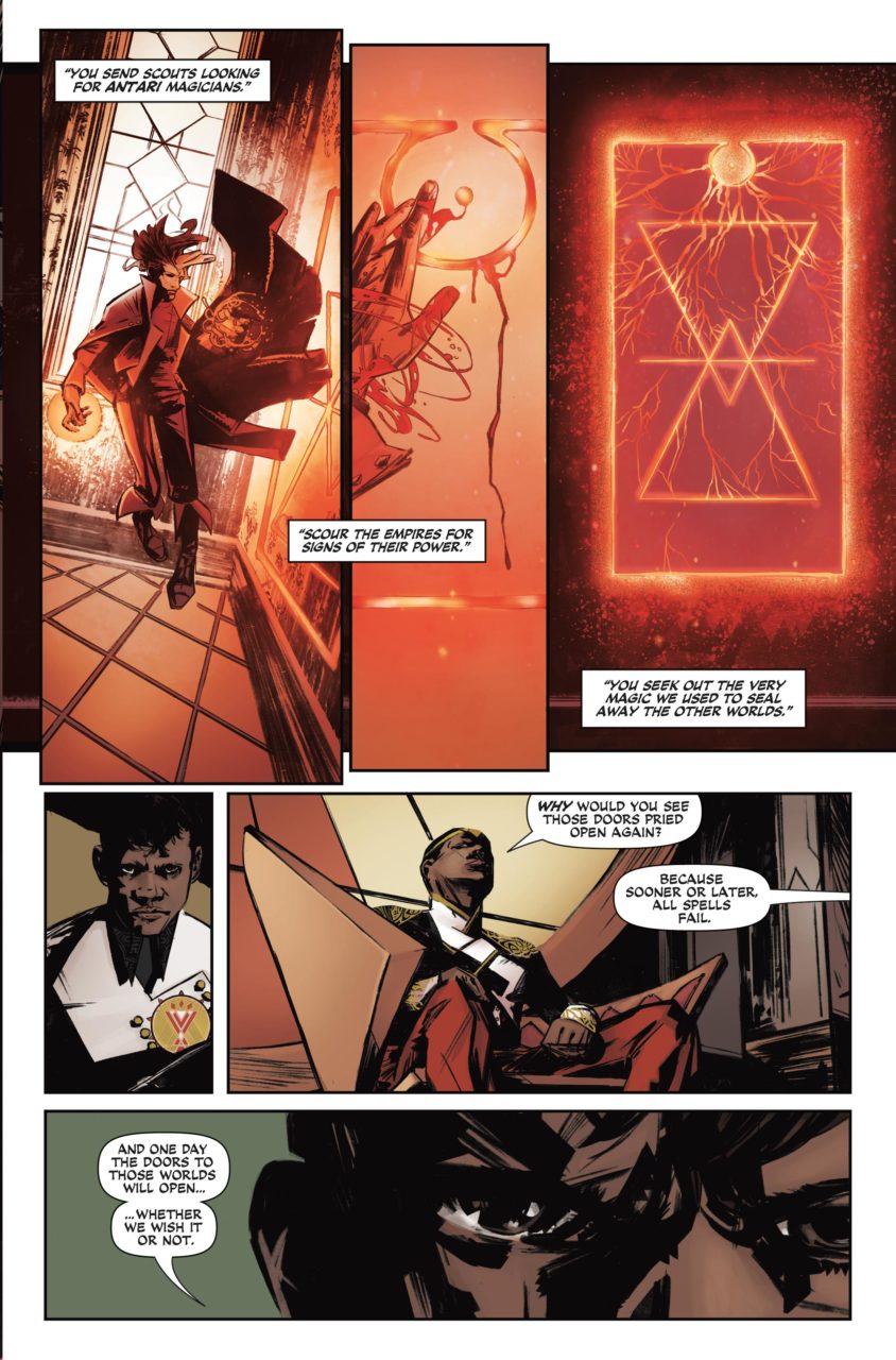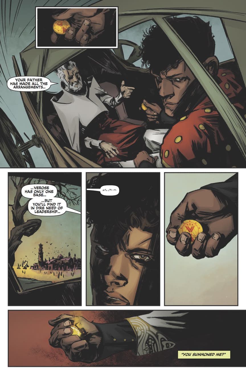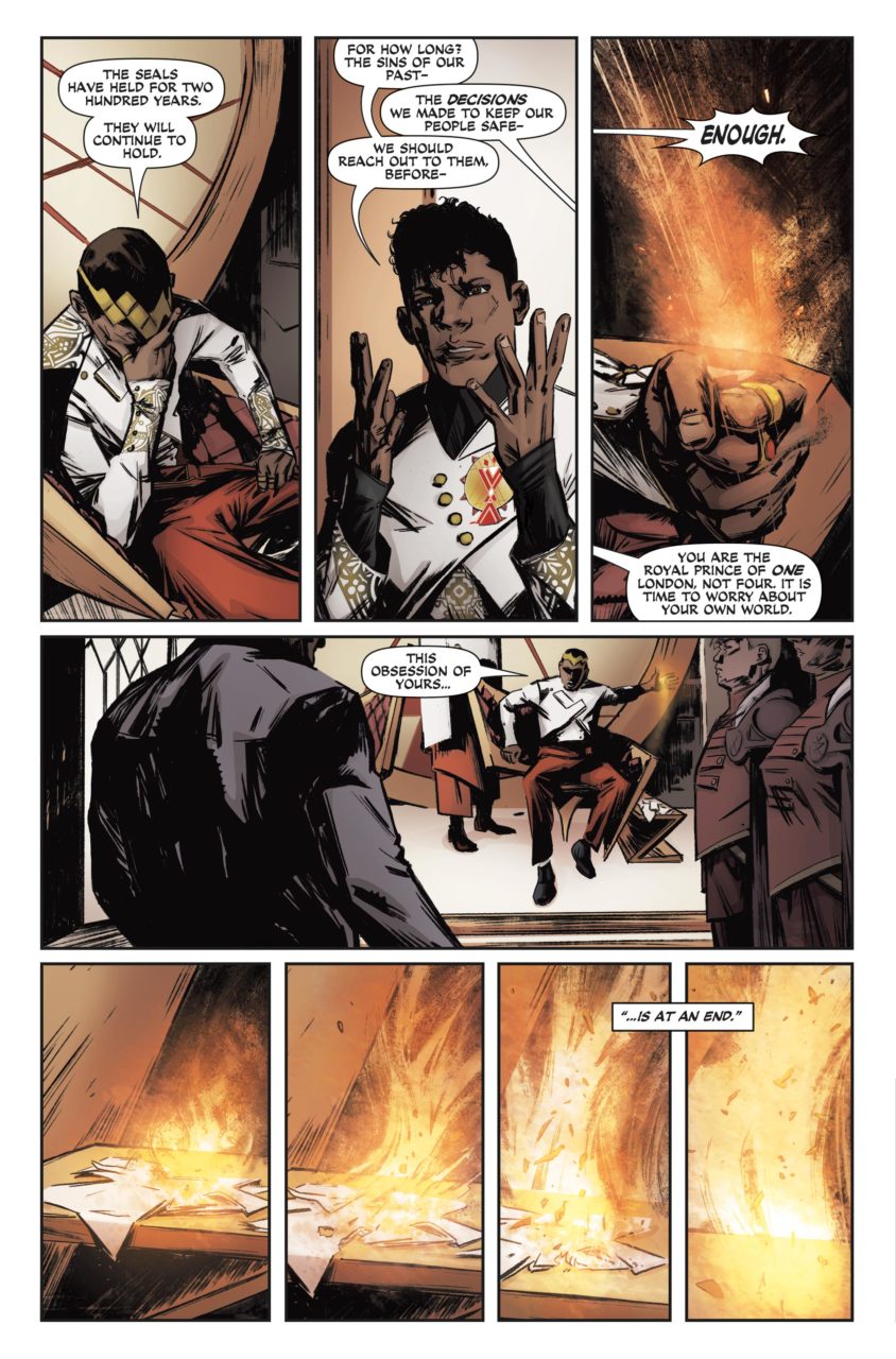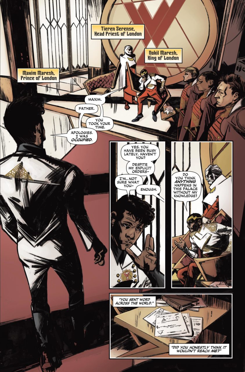 Wendy: In issue #1, Schwab includes the dialogue from A Conjuring of Light that first names Maxim as the Steel Prince. As she notes there, it pretty much begged to have his story told, especially considering what he does in that third book. Prior to that, I hadn’t entirely cared about him. He was a harsh and emotionally distant king who ruled his sons with a firm hand that focused on trying to keep them in line and trying to get them to understand their responsibilities. Seeing him now, it’s not exactly the trope of an irresponsible prince who has to grow up into this cold and calculating responsible king. There’s certainly some growing up that he has to do here, but I appreciate that he is and always has been focused on the needs of the people, even if he doesn’t exactly know how to go about being among them. Like, dude, you can’t walk in there with a shawl draped over your fancy coat and call that a disguise.