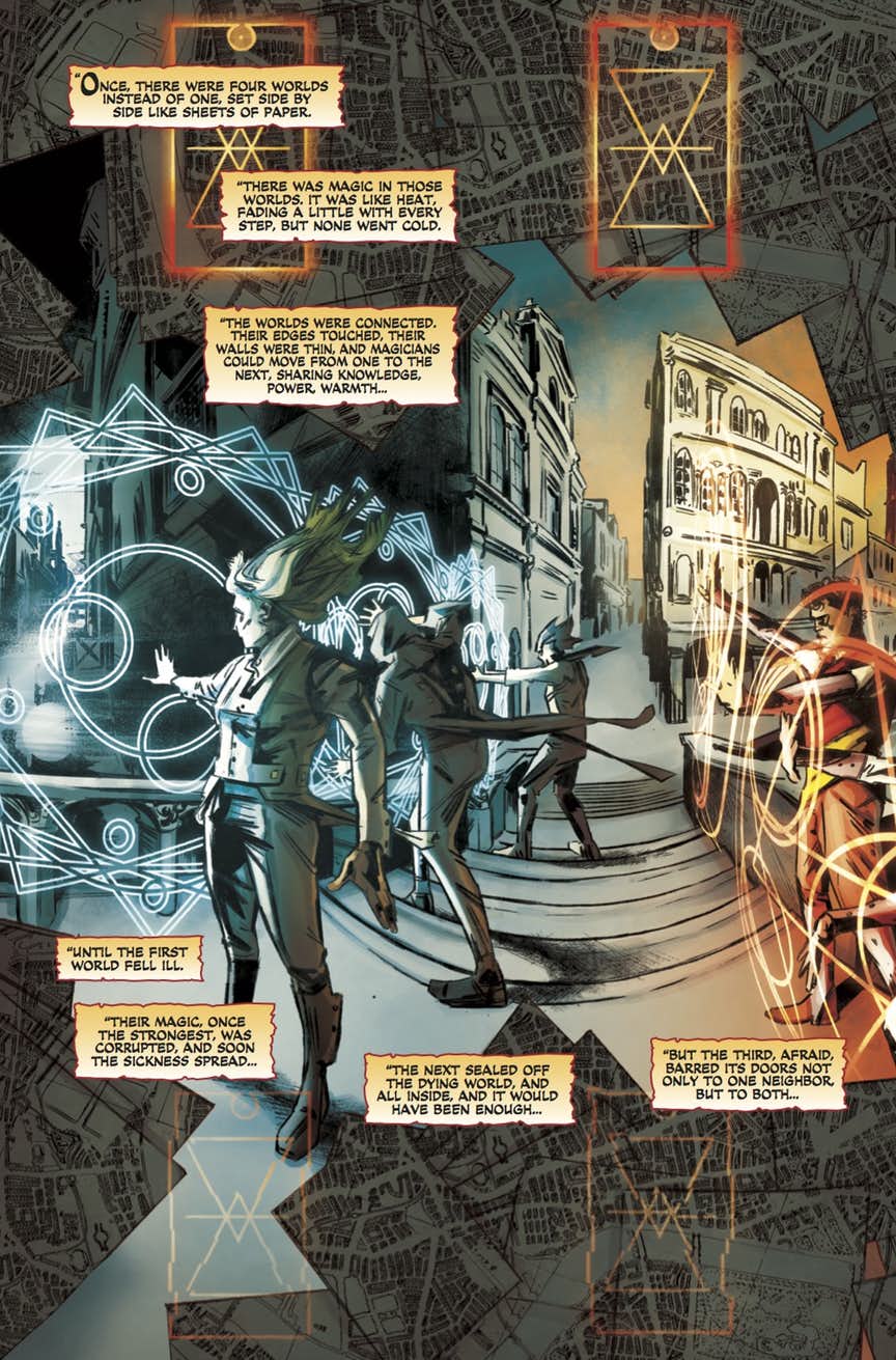 Kelly: As much as I loved the character designs and costuming, I found the art a little difficult to get along with. Primarily because of how heavy some of the linework and shading is. I always imagined Red London, even the not so nice parts, to be the brightest and most magical looking of the four, but reading this I found myself wondering how you would differentiate Grey London when this one is so gloomy. I mean, it hardly looks as though it smells like flowers there.
