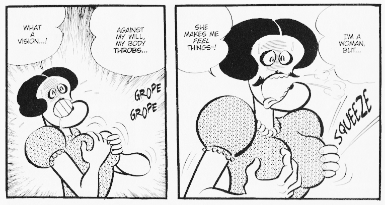 The manga’s fascination with female bodies extends from the beautiful to the grotesque. Alphonse, Honey’s lesbian schoolteacher, is portrayed as a crude hominid that would look at home as an extra in Popeye. The dean, Histler, is a stooping, hatchet-faced sadist who delights in whipping any girls she catches misbehaving. Similarly sadistic is the Sukeban gang, who turn up as secondary antagonists: a clique of ugly-faced, saggy-bosomed lesbians ruled over by the towering, Hulk-like Naoko. This monstrous schoolgirl is so repulsive that Honey is able to defeat her simply by showing her a mirror. (“I feel bad for that poor girl,” muses Honey after her victory.) Go Nagai clearly relishes sketching out every detail of the manga’s female grotesques, from Naoko’s chestful of hair to Alphonse’s curly mustache.