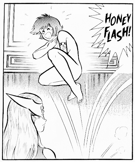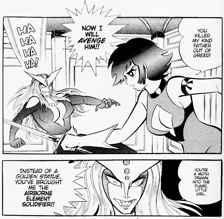 The tone of the narrative has a similar quick-change quality to it. One minute Honey’s friends are being brutally massacred by Panther Claw, with not even comic reliefs being spared, and the next minute the reader is being treated to light-hearted japes as Honey tries and fails to have a hot bath in peace. Even the climactic showdown between Cutie Honey and Sister Jill (the Darth Vader to Panther Zora’s Emperor Palpatine) has this tonal whiplash, the tense confrontation being undercut by the fact that Honey has unknowingly turned up for battle naked.