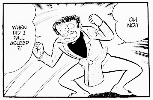 Those prepared to dismiss Cutie Honey as an exercise in rank misogyny may be comforted by the fact that Go Nagai is unafraid to put male bodies on show, and once again shows a fondness for the grotesque. Seiji’s elderly father is, like Alphonse, sketched in as a bizarre simian-like figure. One comedy sequence has a villain slice off his clothes, leaving him dangling from the window naked, and giving a nasty surprise to a person in the apartment below. A later addition to the cast is a bumbling male detective who suffers from such acute hemorrhoids that he spends all of his panels naked from the waist down, at times with cartoon blood dripping from his afflicted posterior. Somehow, Honey’s repeated clothing loss seems comparatively dignified…