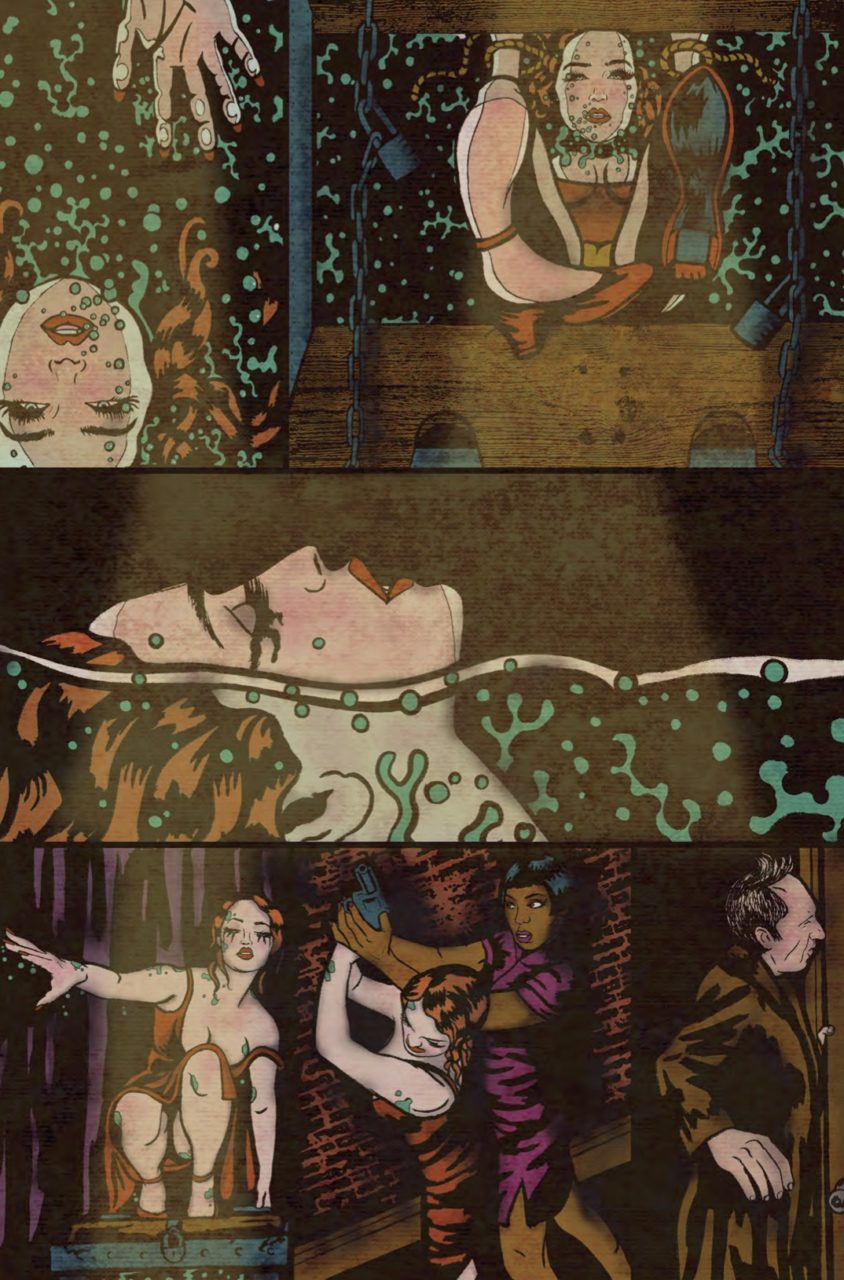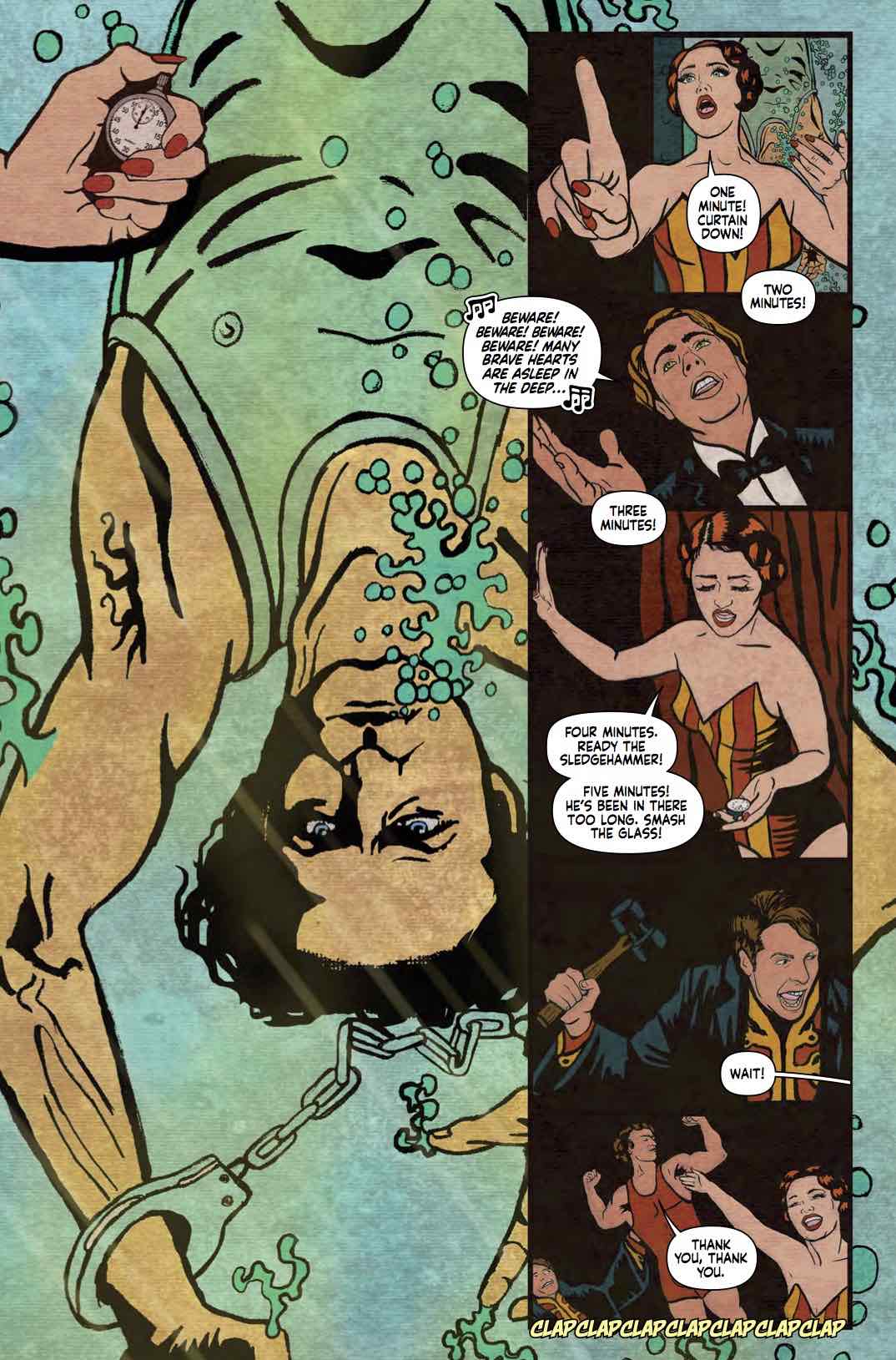Minky’s tenacity gets her deeply involved in the life of both Houdini and his wife. Von Buhler smoothly absorbs Minky into this moment in history, raising as many questions as she does answers about Houdini’s death, while painting a glamorous image of the world and Minky herself. Von Buhler’s skills as a storyteller and artist are captivating. Though the comic, by its nature, is not as immersive as a play would be, Von Buhler’s creativity wraps the reader up in the story, making it impossible not to keep turning the page to discover not only the next step in the mystery, but how Minky handles each and every one of those steps.