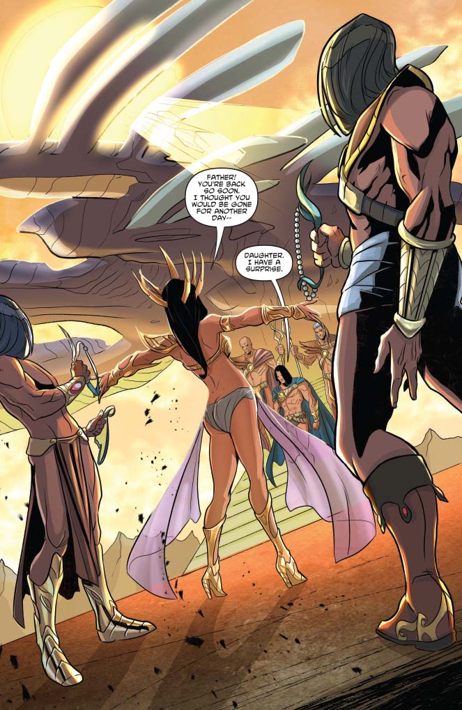Artist Pasquale Qualano does the job competently within each panel. Dejah Thoris is expressive, the white apes and other monstrous creatures are suitably vicious, and the landscape of Mars is stark and desolate. Qualano seems to have a grand time dressing the princess of Barsoom. While the armour that appears on the covers of the original single issues and that she wears on her expedition remains the same, she parades through the castle in variations on her minimalist coverings, with extra attention paid to her headdresses. I won’t ask how she frequently traverses the sandy terrain in six-inch heels, but her ever-changing attire was a nice touch, especially the scene where she changes, aided by her guard, in order to greet her father in her flowing loin clothes, instead of her armour.