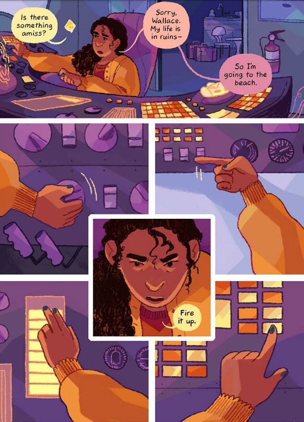 Obvious care is given to every element of the design, from panels to word bubbles. The latter in particular stands out with colours and curving, looping lines connecting the dialogue. The lettering and colour and design of the world