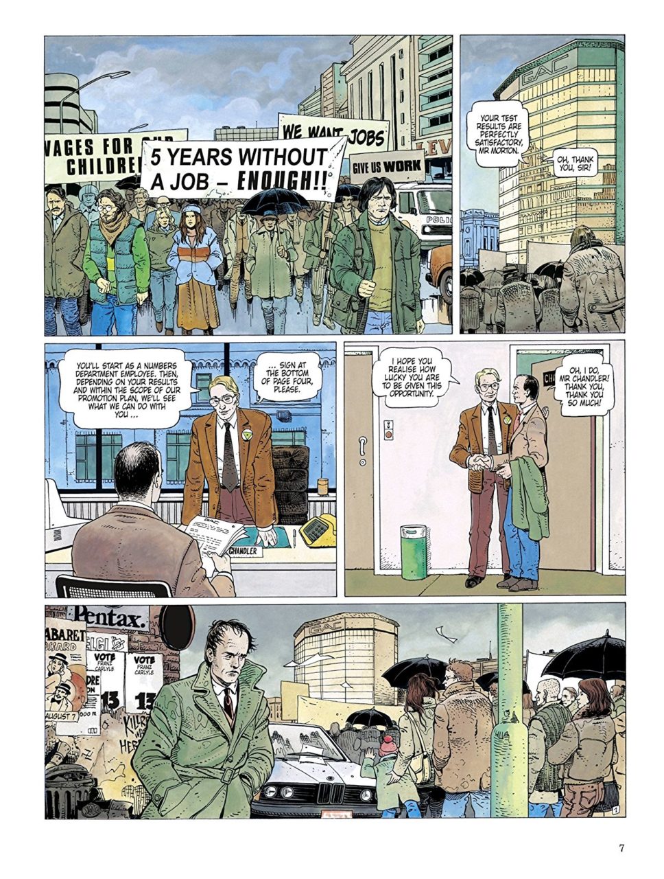I also like that writer Jean Van Hamme chose to have a single mother as a protagonist. Michelle is in a high-stress situation, but all the little things we do to relieve stress—such as eat a little ice cream or walk outside for a breath of fresh air—are considered infractions against the health plan. So, when the opportunity to escape this life presents itself, she immediately jumps at it.