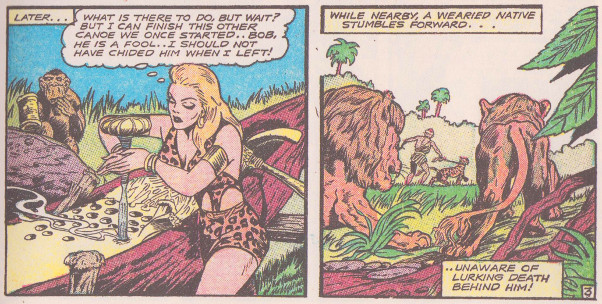 Most of the book’s heroines are—for all intents and purposes—the same character, albeit with an assortment of hairstyles and costumes. The supporting casts likewise tend to overlap, although they do show a degree of variety. For instance, the protagonists have slightly different relationships with the animal characters around them. Sheena has a pet chimpanzee named Chim; other jungle girls are able to communicate with animals, calling for the aid of elephants, lions, and other formidable allies when necessary. Judy of the Jungle makes it her practice to save not only people from predators, but also herbivores, killing a lion so that a deer may live. (“Thus die the evil prowlers of the jungle!”)