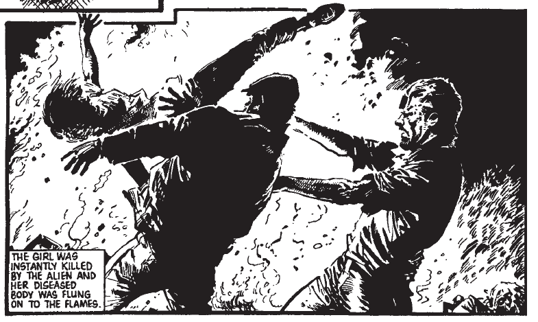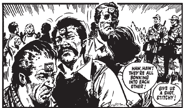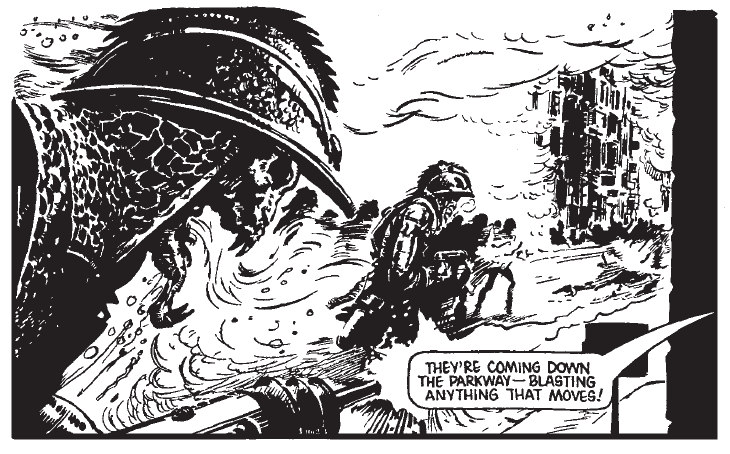 By and large, “Invasion 1984!” is a strip that derives its horror from ideas rather than gore and guts. Entire cities are wiped out by both sides; stricken soldiers commit suicide for the good of their mission; and civilians too battered to serve the invaders are thrown onto bonfires, incidents that do not need lurid detail to be chilling. A typical instalment has the Storm Squad finding a band of civilians who have been permanently transformed into remote-controlled slaves by the aliens; obtaining one of the control devices, two of the soldiers amuse themselves by treating the poor souls as puppets (“Haw, haw! They’re all bonking into each other!”) and are harshly reprimanded by their Major (“Next time I catch you and your brother goofing off, I kill you!”) In more traditional war comics such conduct would have been reserved for the villains, not the nominal heroes.