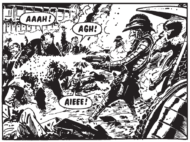 The story is divided into three-page instalments, with almost every one structured so as to build into a cliffhanger. This makes the comic a trifle exhausting to read long stretches in one sitting, but it’s easy to imagine an adolescent of the 1980s eagerly devouring the bite-sized chunk of cathartic brutality dished up every week. While not exactly subtle, the comic shows a definite craft, a good example being its reticence in terms of graphic violence: although sundry characters are sliced up or shot to bits during the course of the story, the bloodshed either occurs off panel or is obscured by a carefully-placed white flash, the details left to the reader’s imagination.