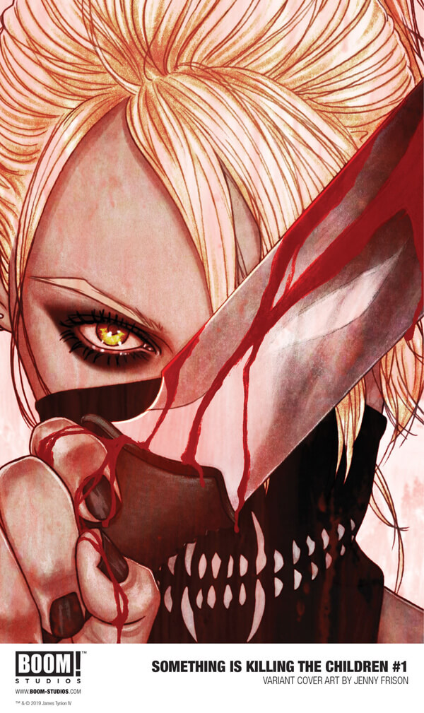 Cover for Something is KIlling the Children 1, Jenny Frison, BOOM! 2019 - A blonde holds up a blood-stained knife to the camera, obscuring their face, which only shows yellow eyes and a toothed half-mask