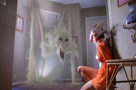 Rather than the Satanic force of The Exorcist, the phenomena in Poltergeist is caused by human spirits whose graves have been disturbed. Most are presumably benign – one manifests as a glowing, angelic apparition – but a particular spirit has become so corrupted by anger that it is, for all intents and purposes, a demon, being identified as “the Beast” and eventually appearing as a distorted skeletal entity. Poltergeists are traditionally invisible – but Poltergeist is not the sort of film to shy away from making its monsters front and centre.