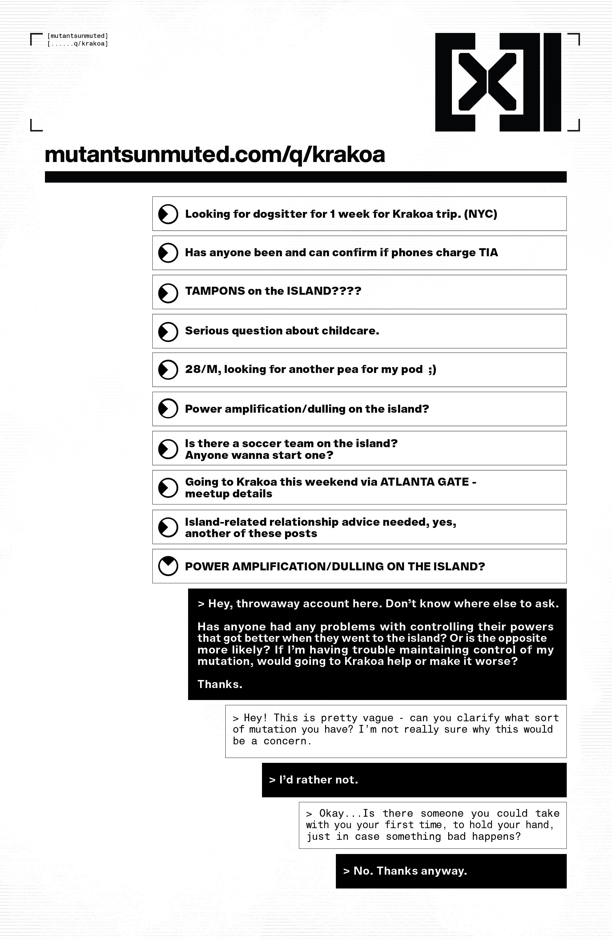 This page shifts the scope of data pages we’ve seen so far in the book, which by in large have focused on building a schema of mutant magic from the ground up, and looks at the more mundane ways in which mutants live their daily lives. Details like social media are engaging forms of world building because they contextualize the way people in universe live in the everyday, and this data page expands the world of the X-Men by showing a new way in which mutants interact and detailing how this forum in used to better contextualize the advent of Krakoa in a social context. The data page shows a thread, heavily implied to be one Rictor initiated, that cleverly demonstrates the use of mutant specific forums, and gives a window to an emotional state Rictor doesn’t articulate on panel.