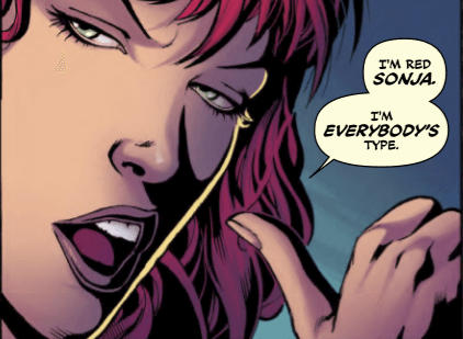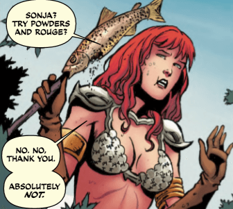 To my dislike, Simone bypasses Sonja’s rape survivor origin. Taking away rape survivor elements of Sonja’s character really makes the series fall flat and lack the emotional punch. I don’t feel Sonja’s emotional motivations leaping out at me from the page. Marvel’s run of Red Sonja that began in 1973 is what the Sonja’s origins in the film from the 80s pulls from. Sonja’s family is attacked and she’s raped. Left for dead, Sonja screams to the heavens for revenge and the red goddess Scáthach from Irish mythos appears. She grants Sonja awesome fighting skills on the condition that she not sleep with any man unless he beats her in fair combat. I would’ve loved to have seen a feminist take of that origin instead.