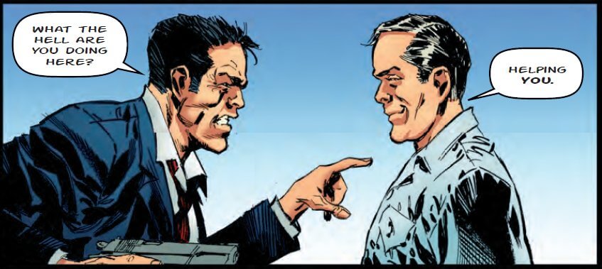 The most straightforward strip in the special is “Dredger”, written by Zina Hutton, drawn by Staz Johnson and coloured by John Charles. The title character is a James Bond-style agent in an adventure that wears its influences on its sleeve, even naming one of its characters after Ian Fleming. This is, for the most part, a typical spy yarn; aside from its graphic gore, it is notable mainly for a subversive ending that questions the morality of Dredger’s superiors and establishes that the protagonist is as much Dirty Harry as he is 007.