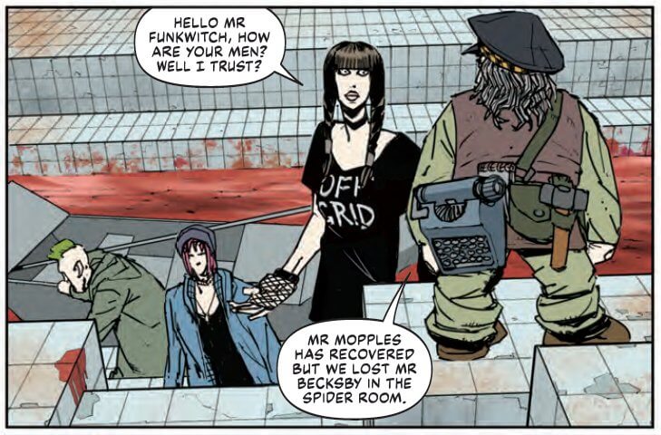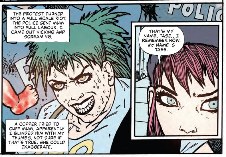 The special’s centrepiece story is “Hell Machine”. Written by Henry Flint, who shares art duties with Jake Lynch and Jim Boswell, this tale clocks in at 15 pages – making it the longest strip in the issue. The main character, a girl named Tase (so called, because her pregnant mother went into labour after being tasered by the police during a protest) is part of a rebellion against a dystopian Britain of surgically-implanted debt chips, police officers genetically engineered to have the faces of babies, and citizens being literally fed into giant blender.