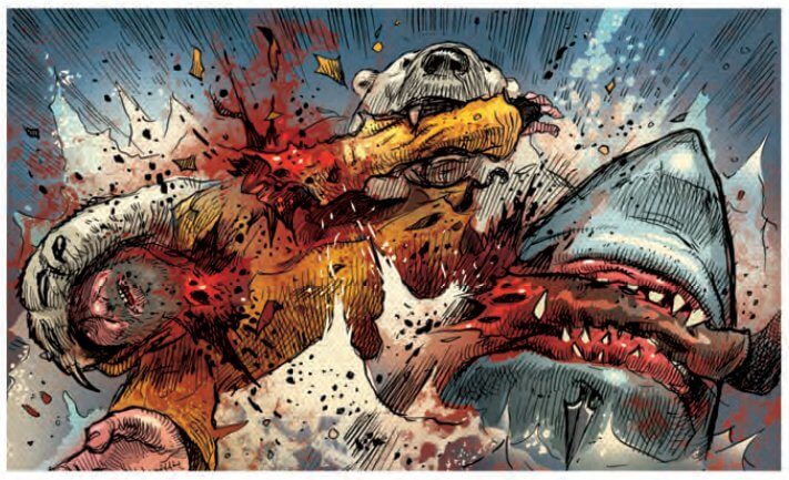 The most famous character to appear in Action, the killer shark Hookjaw, turns up in the 2020 special’s most experimental story. The strip’s subject matter is true to the original, with Hookjaw continuing his reign of terror against all unscrupulous humans who encroach his habitat, this time by freeing a captured polar bear; but while the old version had heavy amounts of villainous gloating from the shark’s soon-to-be victims, this story is told entirely without dialogue. “Quint Amity” gets a writing credit, but really, this is an artist’s piece, with Dan Lish providing evocative seascapes and brutal flesh-chomping.
