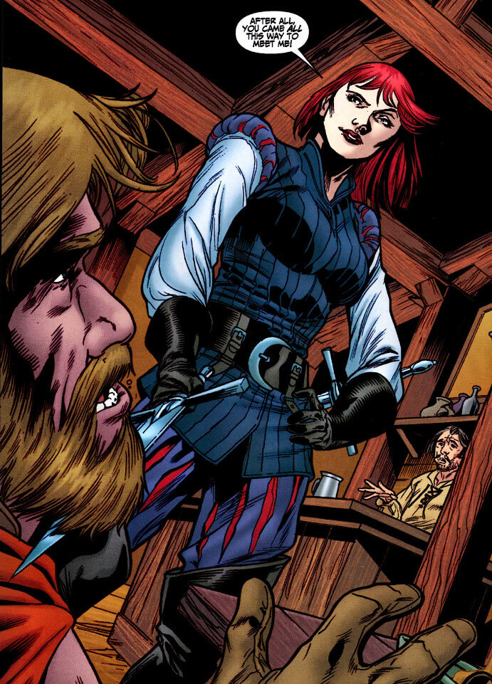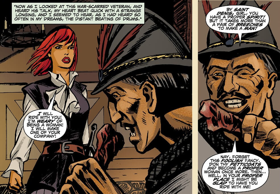 The comic has the double-task of both telling a new tale about Agnes while also introducing her to a readership that might be unfamiliar with the original Howard stories. It begins with a Hessian mercenary barging into a tavern and asking a hooded man – who turns out to be Etienne Villiers — about Agnes’ whereabouts. Without letting on that he is her travelling companion, Etienne tells a story of Agnes’ origin.