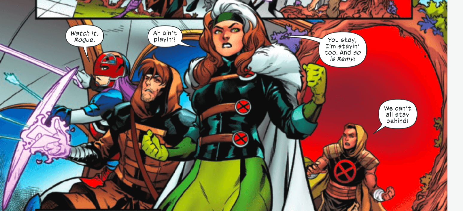 The issue ends with the long-awaited confrontation between the Omniversal Magistrex and Captain Britain, and much like her brother before her, you can cut the sexual tension between Betsy and Saturnyne with a spoon. As Betsy and Saturnyne away to private chambers, Rogue and Gambit are left to their own devices in the Citadel, and they find a suspiciously familiar red gem.
