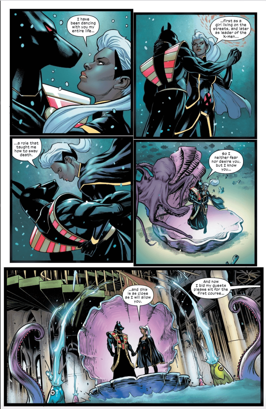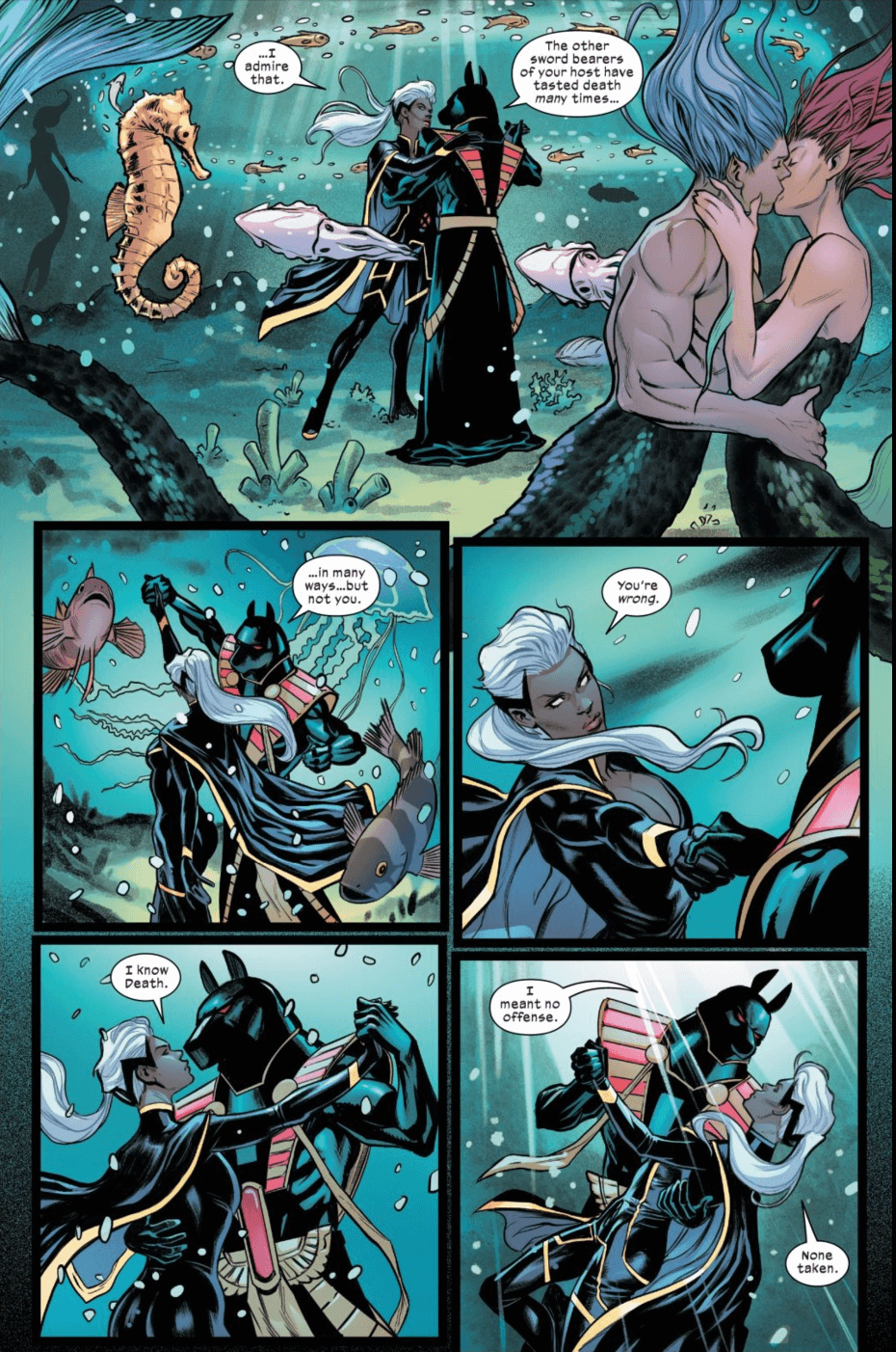 Such pairings are not uncommon for Storm. She seems to attract the kind of men who would dominate a goddess, only to find themselves in submission. I could wander off into any number of fanfictions and headcanons featuring Storm’s lurid affairs with Khan, Dr. Doom, Belasco, or Dracula, but here, her dance with Death is a lot more subtle and interesting, but no less alluring. In her past encounters of attempted seduction, she has been taken against her will and must teach these fools their place. Here, Storm takes the lead. She has already tasted death in her own way, and knows herself well enough now to meet this horseman as her equal. He, in return, is gracious and intrigued.
