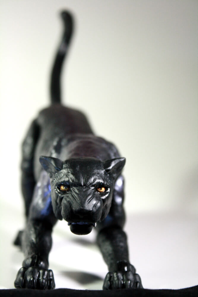Guen has a hinged jaw, a ball-and-peg at the base of the head, another at the base of the neck, another at the ribs, and a peg-and-hinge at the base of the tail. She’s got ball-jointed hips and shoulders (are they still called that on cats?), which are limited in range by the nature of the sculpt, peg-and-hinge elbows and knees (same question), and peg-and-hinge paws. It’s solid articulation, if not quite as impressive as Drizzt’s—she can handle most prowling poses, but can’t really be put into a good looking sitting or pouncing pose, both of which seem like shortcomings when one wants to pose a cat doing…well, cat things. Still, I’m really glad to see this sculpt happen, and I’m hoping Hasbro leans into this license more. Imagine the animal companions we could get! Not to mention, my husband immediately stole Guen too, so it’d be nice to get…y’know, something. For me.