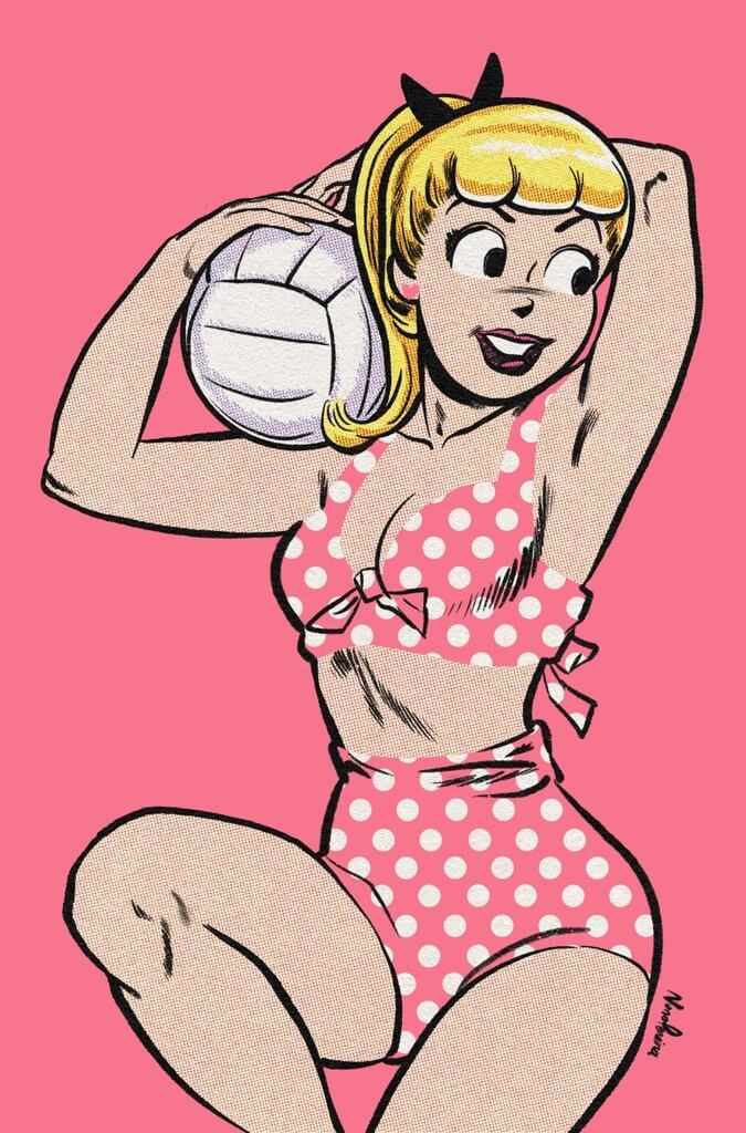 As with previous variant exclusives, Nuno Pereira has drawn the Betty Pop Art retro-style variant cover for Betty and Veronica: Friends Forever: Spring Break #1.  It features Betty Cooper against a pink background in a pink and white polka dot bikini.  Bill Walko, meanwhile, provides a parody of the cover of X-Men#101, which introduced Phoenix, for the same issue. On this cover, Veronica emerges from a wave in a green and yellow bikini wreathed in bright light, while a delighted Archie and Reggie point at her, bearing heart eyes, and a disgusted Betty floats in the foreground. Dan Parent, meanwhile, delivers a parody of the famous “Face it, Tiger, You Hit the Jackpot” scene from Amazing Spider-Man #226, which introduced Mary Jane Watson to the world. In this case, Cheryl Blossom utters the same line to a flustered Archie.