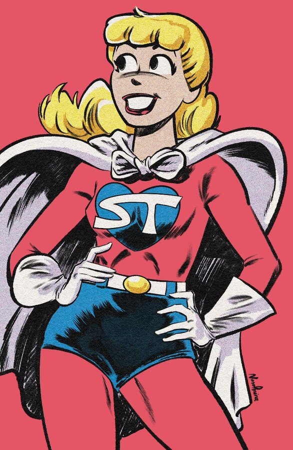 Pereira’s cover is part of his Pop Art series of variant covers for Stadium Comics. This one shows Betty as Super Teen posing energetically against a plain pink background, and it covers Betty and Veronica: Friends Forever: Summer Fun #1.