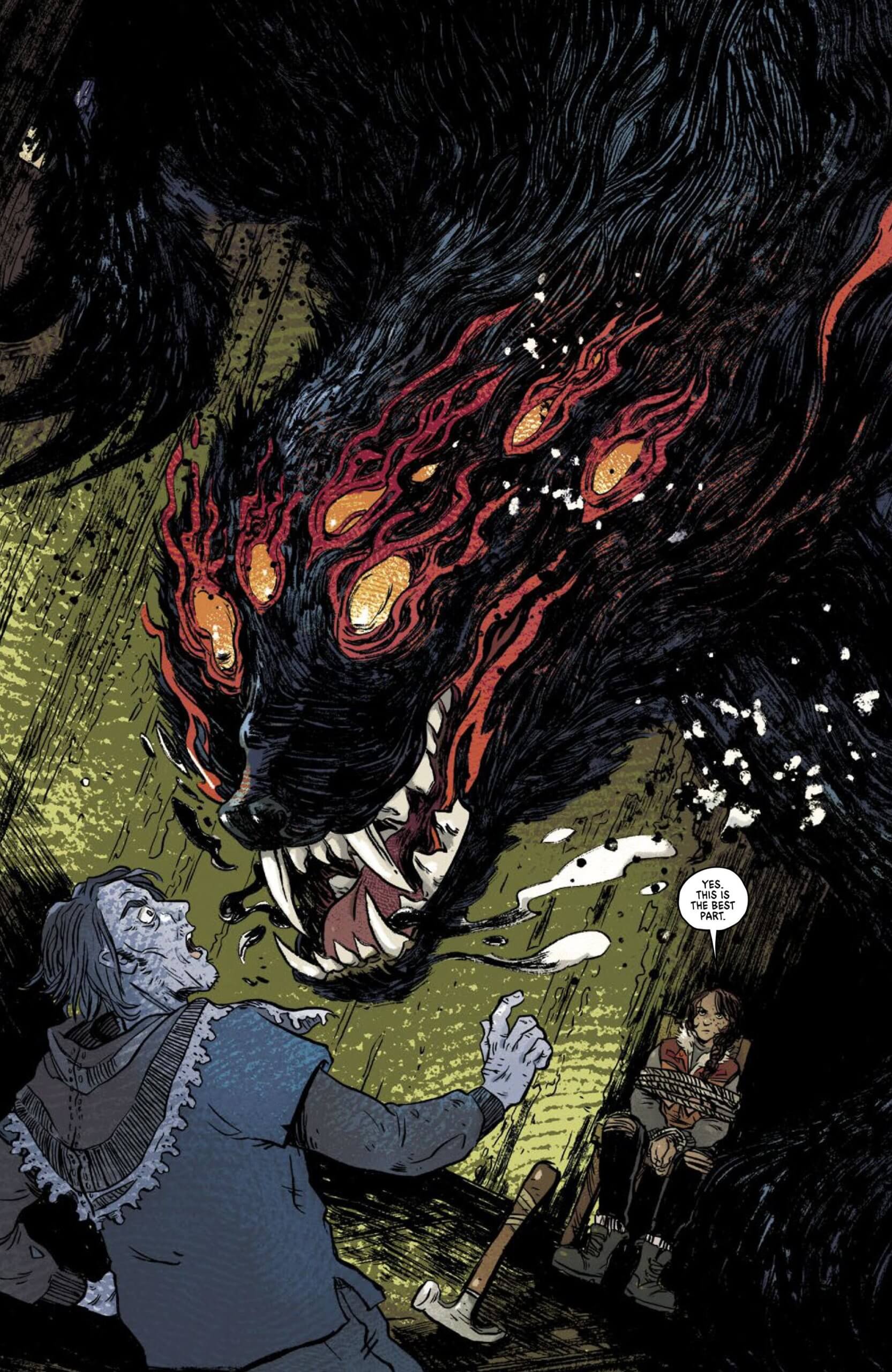 Spoilers for the last issue, but when I realized I was going to have to draw two monsters fighting each other at the end, I knew I had to render them very different texturally to keep the action clear. This new monster, I think I described my design idea for it to Adrian as like, “Saturn Devouring His Son meets the worst petrochemical run-off.” Just something that feels like the worst inky-black suffocating goo that they wash off birds after oil spills.