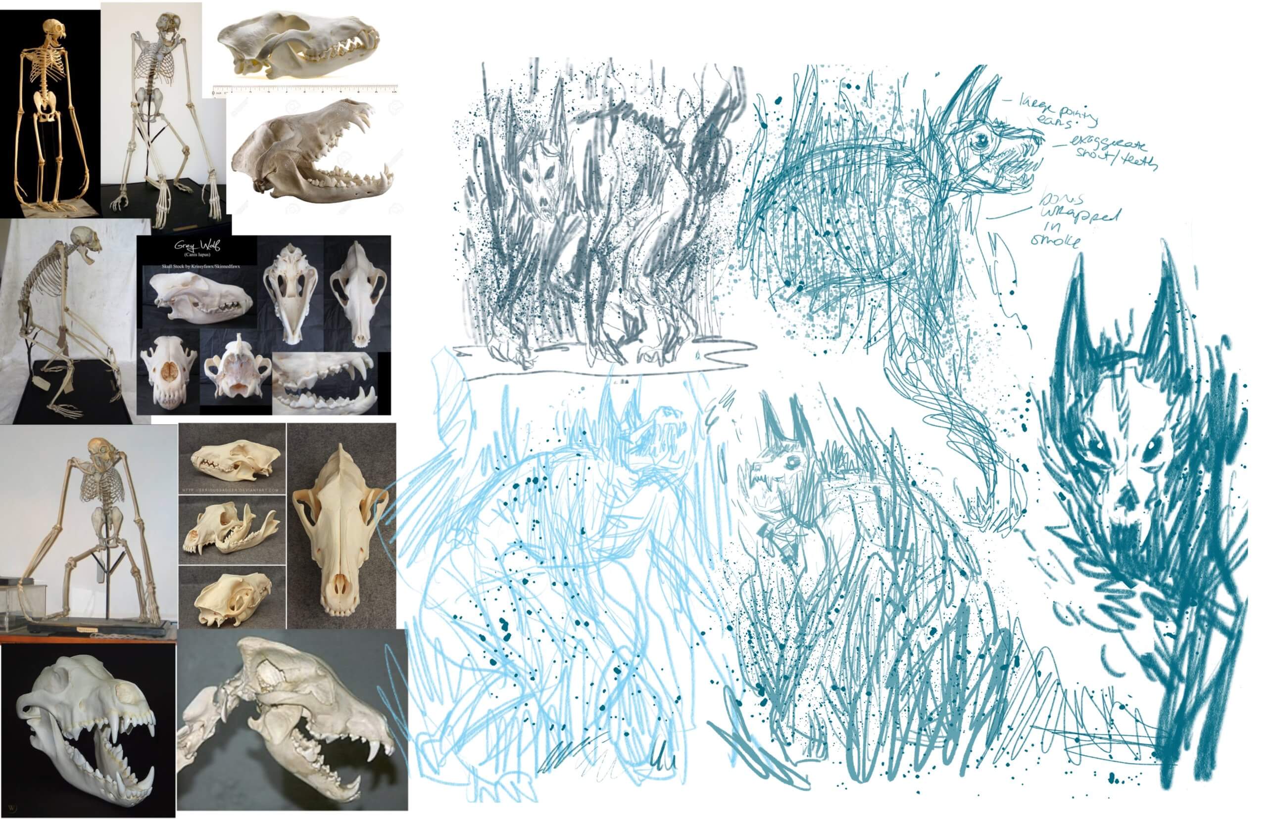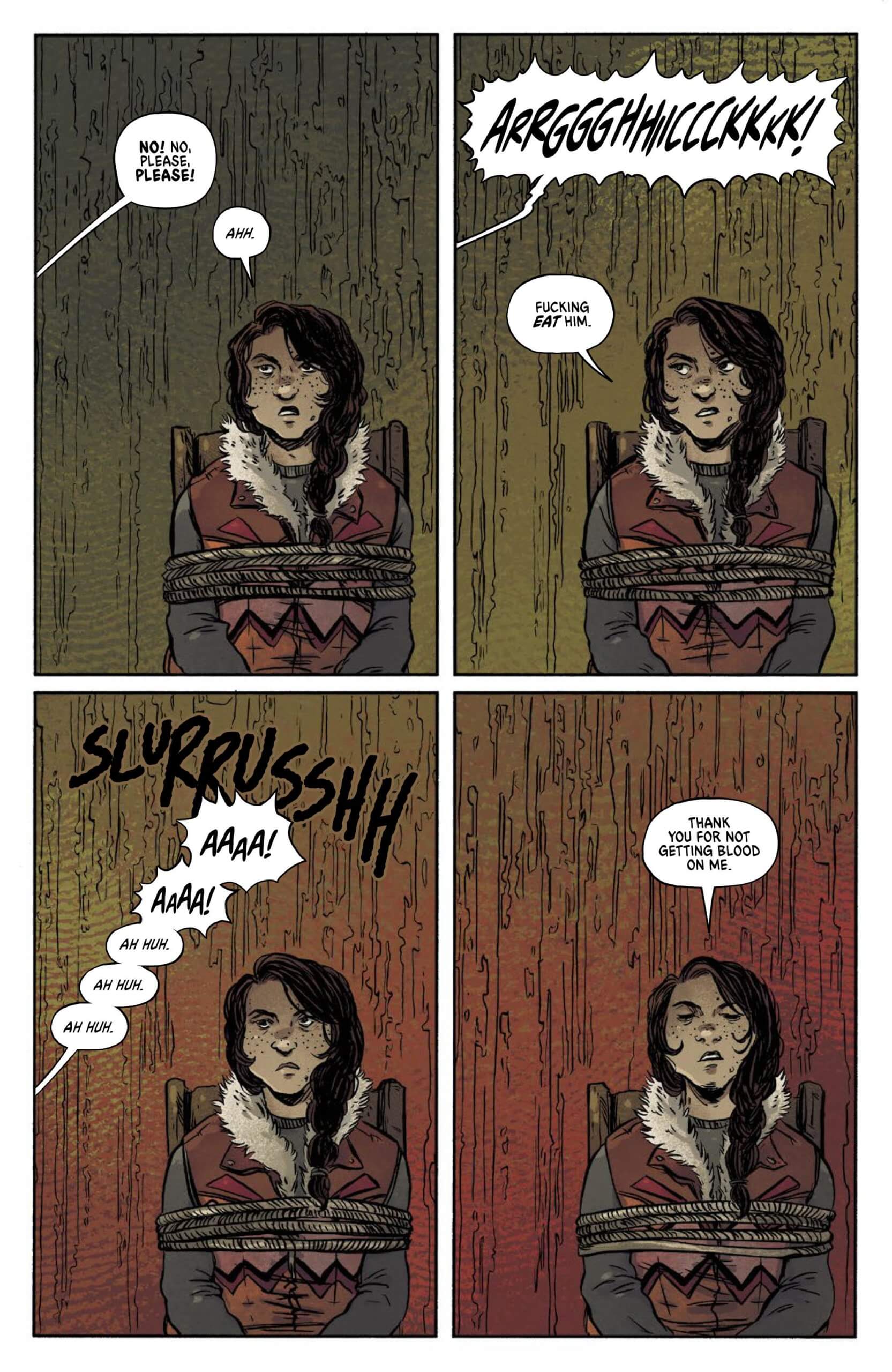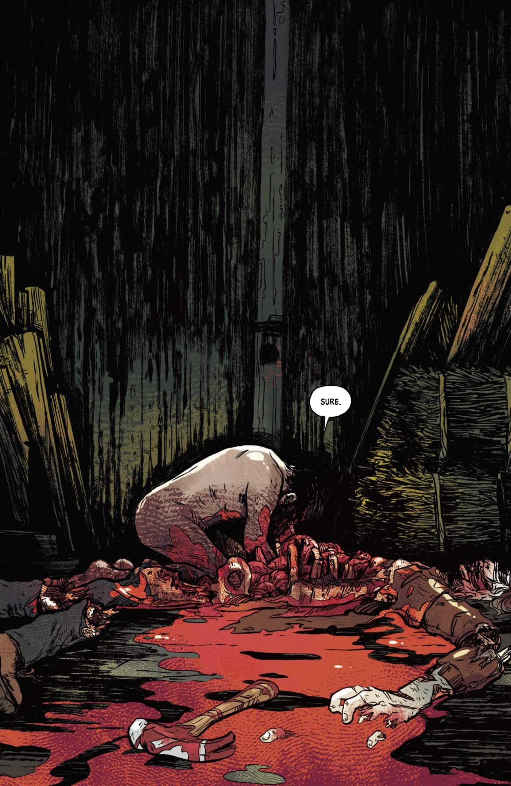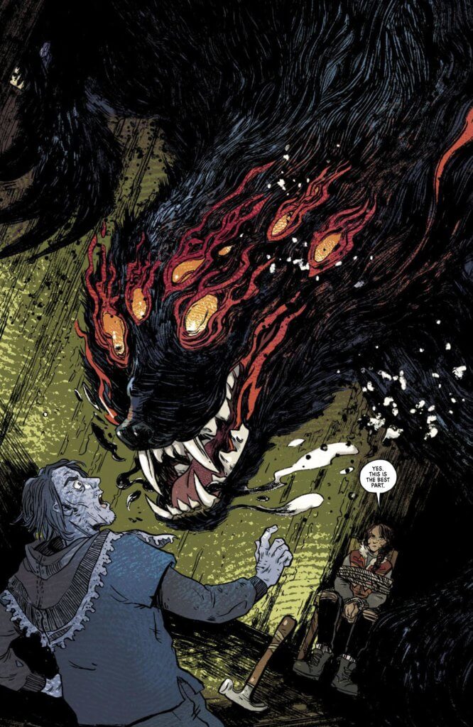 Sally: When Adrian and Paul and I first started talking, they were clear that it wasn’t a werewolf story, I wasn’t drawing a werewolf. I’m trying to draw something with teeth and claws and fangs, something that feels like a blur, something that’s incorporeal and always shifting like shapes in a dark room. Since I wasn’t drawing just a wolf, I had to say, well, what creatures freak me out? The proportions of gibbon skeletons freak me out. Komodo dragons freak me out. Those elements work their way in. It really crystallized for me once I got to inking — I shredded up some Pentel Pigment brush pens to get that staticky dry brush and it felt perfect to me.