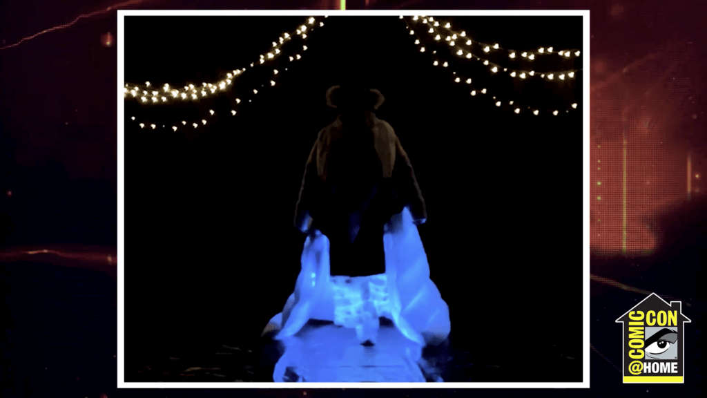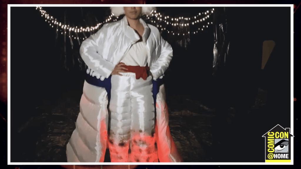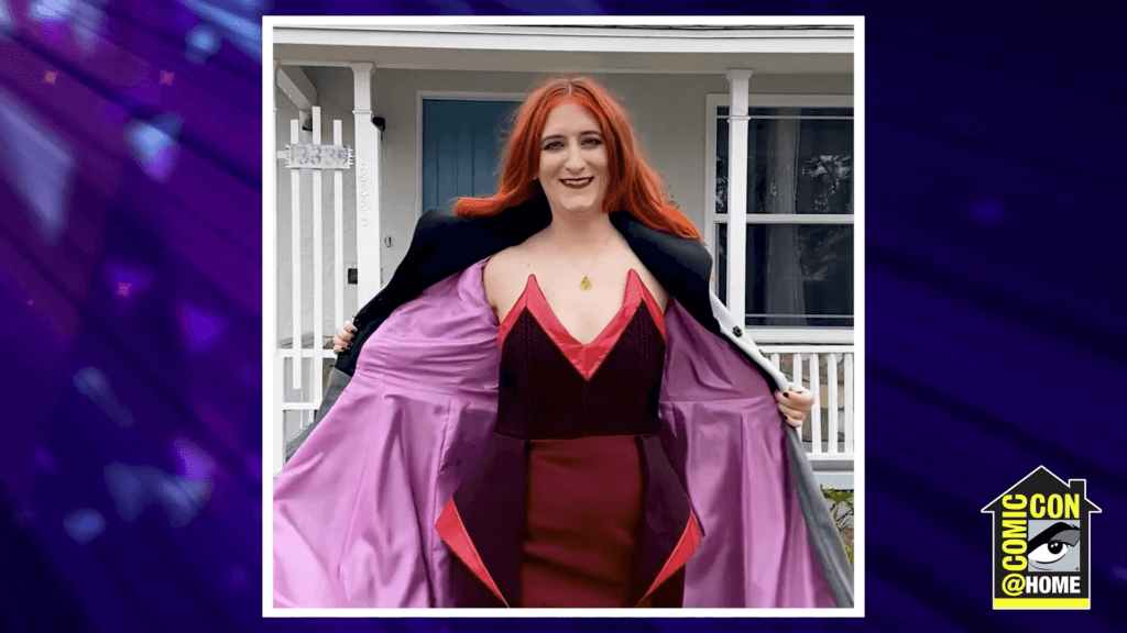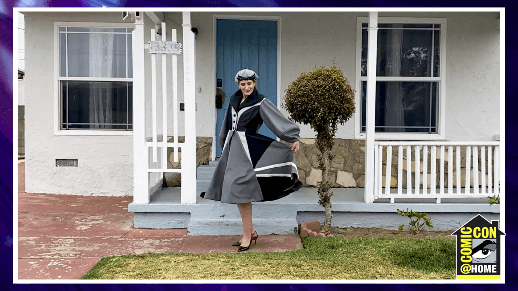 There was a great reveal for a WandaVision “black and white” coat to a Scarlet Witch dress underneath, and the designer made the best use of the “I’m making a video why do I have to stay in one location?” aspect of pre-recording.