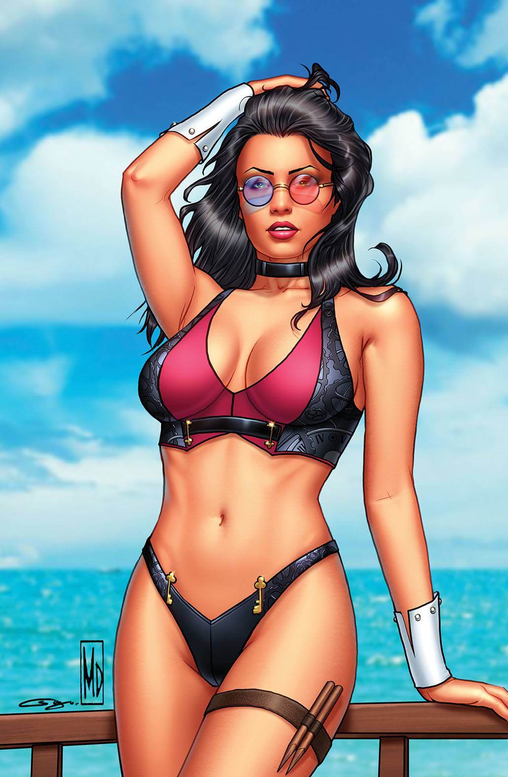 Thankfully, the women do get unique identifiers to prevent them from simply being Blond on Beach or Brunette at Pier. The bikinis are itty bitty, but still save enough room for a few embellishments such as Skye Mathers’ apple decals, or — my favourite — Liesel Van Helsing’s steampunk cogs and keys by artist Michael Dooney. But the poses themselves are largely uninspired. We’ve seen all of these poses before — and even see a few of them duplicated with little variation right in this issue.