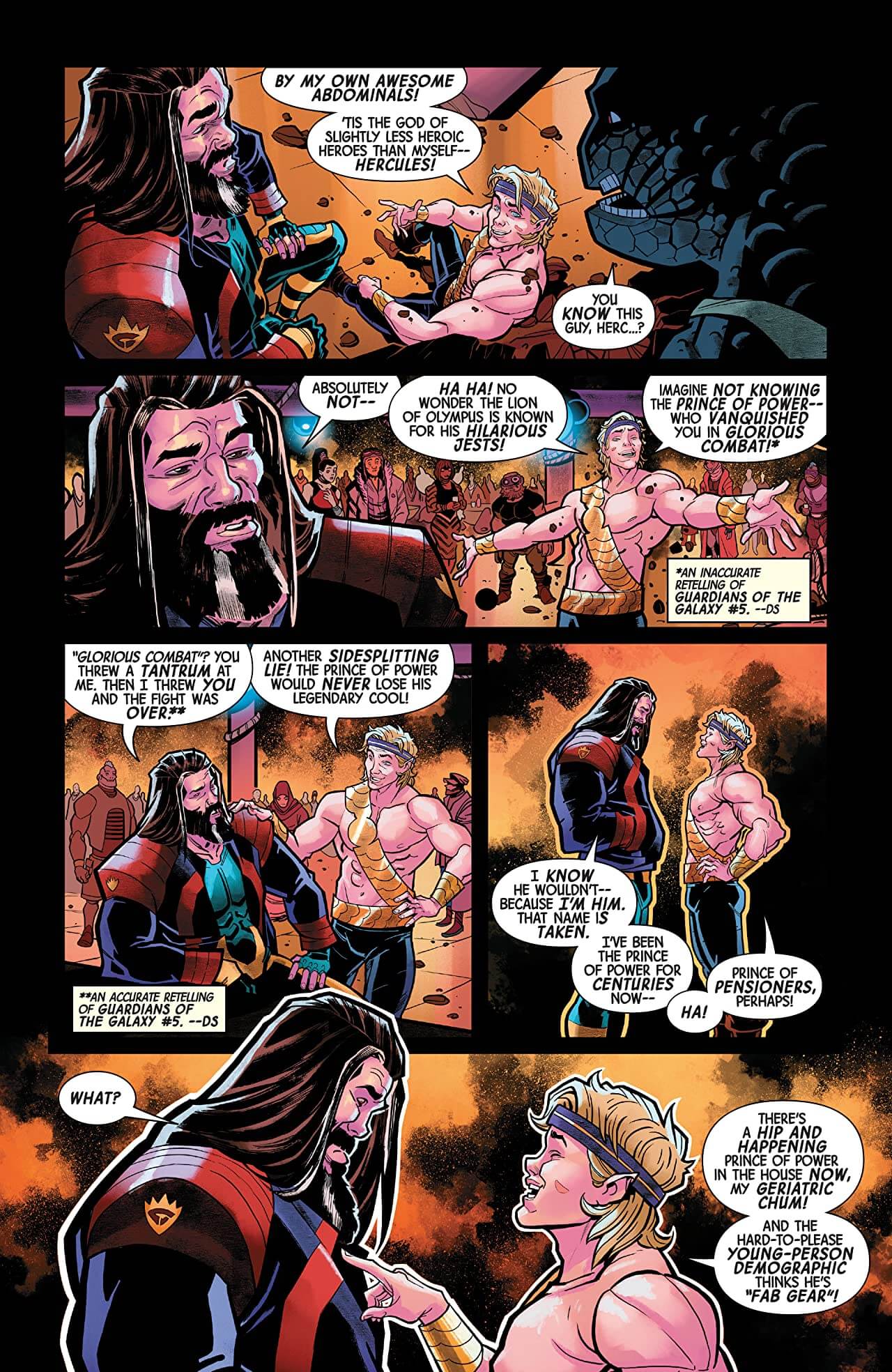 There are oh so many tweaks toward The Masters of The Universe to be had as The Prince of Power explains that he was born second in line to greatness — not even interesting enough to be considered an evil twin to his brother, Majestar. His Prince Valiant-slash-Greek Mythology-lite tragic background is pretty hilarious, involving ingestion of a magical amulet (which turns out to be the purple Infinity Stone) and a career of counting paper clips. His mother names him ‘Prince Otherone.” It’s a goofy script by Al Ewing that’s completely memorable. When The Prince of Power realizes the only way to be more powerful involves having to learn things, he shrugs and starts pumping more iron. He’s dumb in the best of ways and I truly enjoyed him.