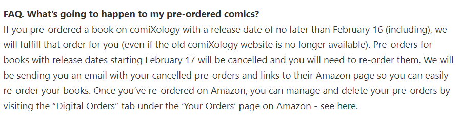 The day readers have dreaded since Amazon’s acquisition of Comixology in 2014 is finally arriving; the site is being taken down, its services folded directly into Amazon itself, presumably because Bezos cannot help himself from making customer experiences worse for his own profit. Worse how, you might ask? Well, as part of the move, comics preorders and subscriptions on Comixology are being canceled, rather than transferred, with the onus on customers to then re-up these things manually on Amazon’s website. Additionally, as if that weren’t bad enough, customers outside of the US will have no option to subscribe to comics at all, despite that service previously existing on Comixology.