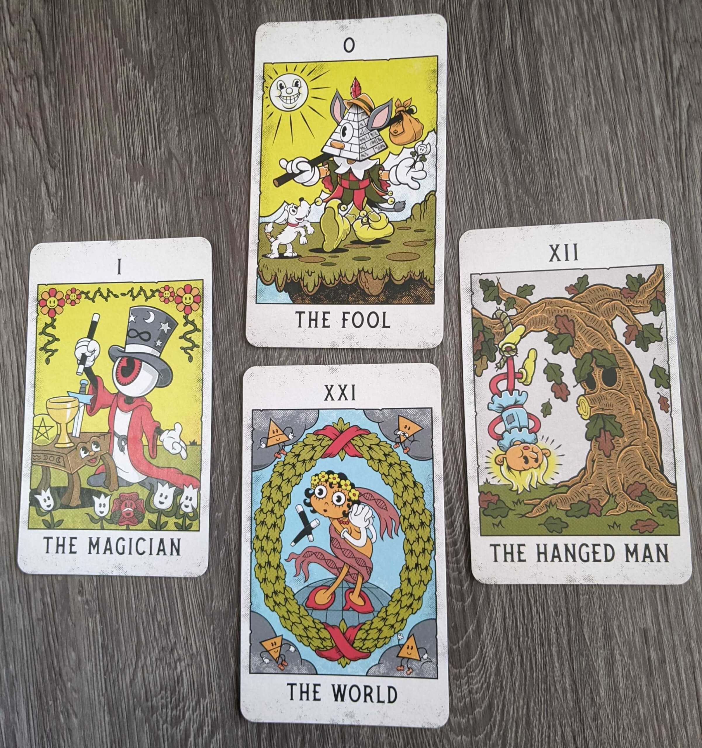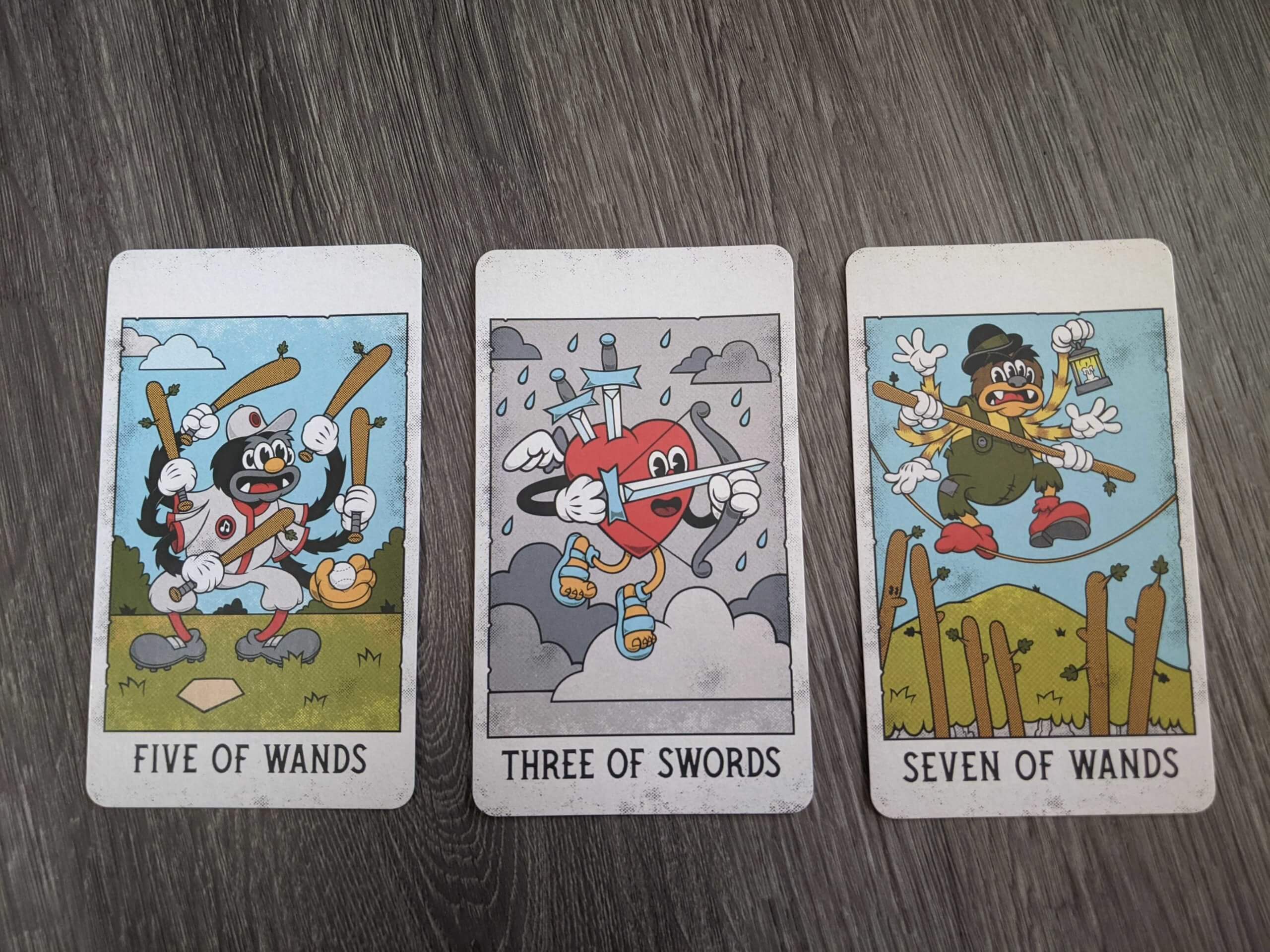 Mystical Medleys was made by an animator with an interest in tarot, not a tarot artist with an interest in animation, and I think it’s really interesting that I can tell the difference. In the guidebook, creator Gary Hall talks about his passion for animation and it got me thinking about the similarities between tarot and cartoons in a way I had never considered before. “How do cartoonists convey meaning?” he wrote. “They pack it all into imagery, using visual shorthands to reference bigger themes.” This is exactly how tarot works too, of course, where the art is full of symbolic shorthand—even the suits themselves are used to suggest different spheres of life, like the coins in the suit of pentacles and how they represent material wealth and, even more generally, the concept of hard work and success. Once I thought about it, the similarities make sense, as both media are often trying to convey something meaningful and profound, even with limitations placed around what can be shown. As a big fan of vintage and modern cartoons, this new connection between them and the tarot is delightful to me.