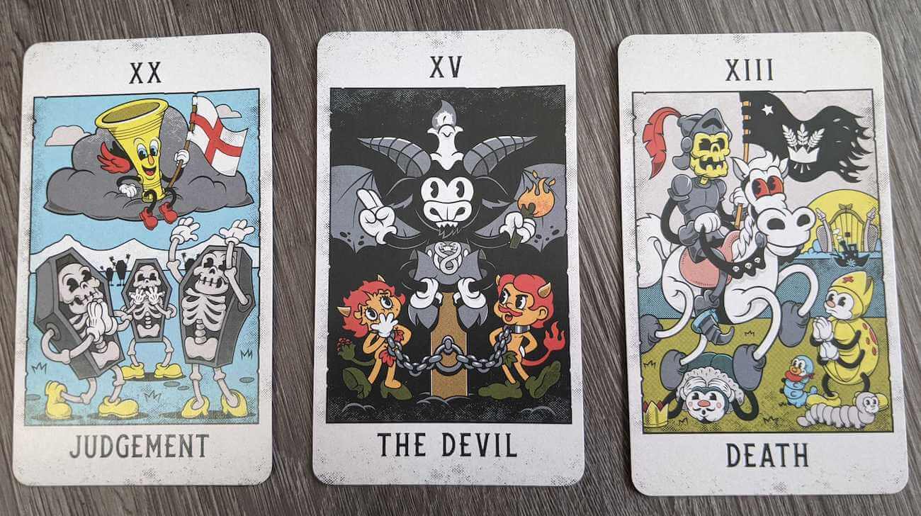 But Mystical Medleys is the exception that proves the rule: while nearly all the cards are pretty direct re-draws of the original RWS art, that’s exactly what is so compelling about this deck. Seeing the imagery that I’m so used to converted into these classic cartoon characters is extremely fun for me as a tarot enthusiast, and it creates a fascinating dichotomy between the comfortingly familiar and the curiously strange. Everything about the deck walks this line: at first glance, Gary Hall’s art is very cute, but the longer you look at it and the deeper you delve into the layers of symbology, the more creepy and unsettling the art seems to get before your eyes. And to be clear, I love this about it—it’s a great callback both to the witchiness of tarot and to classic cartoons, which absolutely have their fair share of creepiness as well! The art is more or less based on the “rubber hose” style of animation that both early Disney and Fleischer Studios were utilizing in the 1930s, so named for the lack of articulation in early cartoons. But Mystical Medleys reminds me more of Betty Boop titles like Fleischer’s 1933 masterpiece, Snow White, which famously featured a delightfully creepy rendition of St. James Infirmary by a ghostly Cab Calloway.