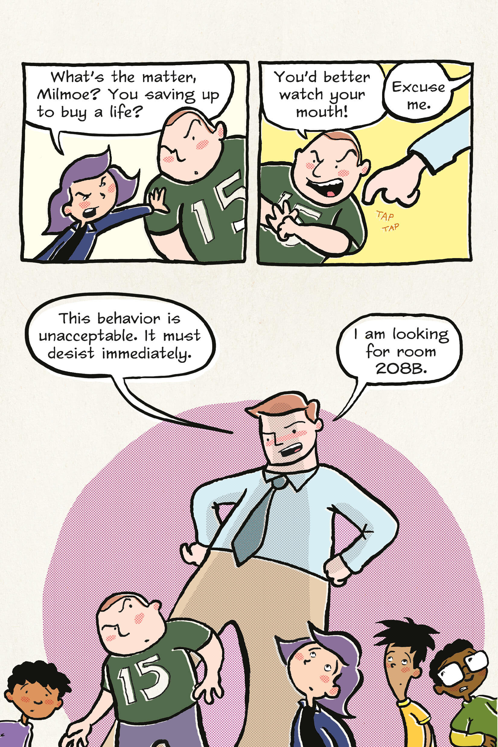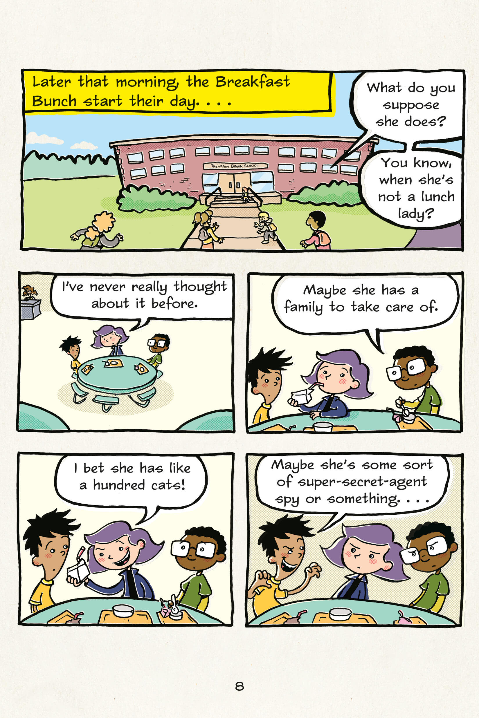 “Hector, Terrence, and Dee have always wondered about their school lunch lady. What does she do when she isn’t dishing out the daily special? Where does she live? Does she have a lot of cats at home? Little do they know, Lunch Lady doesn’t just serve sloppy joes—she serves justice! Whatever danger lies ahead, it’s no match for LUNCH LADY!”