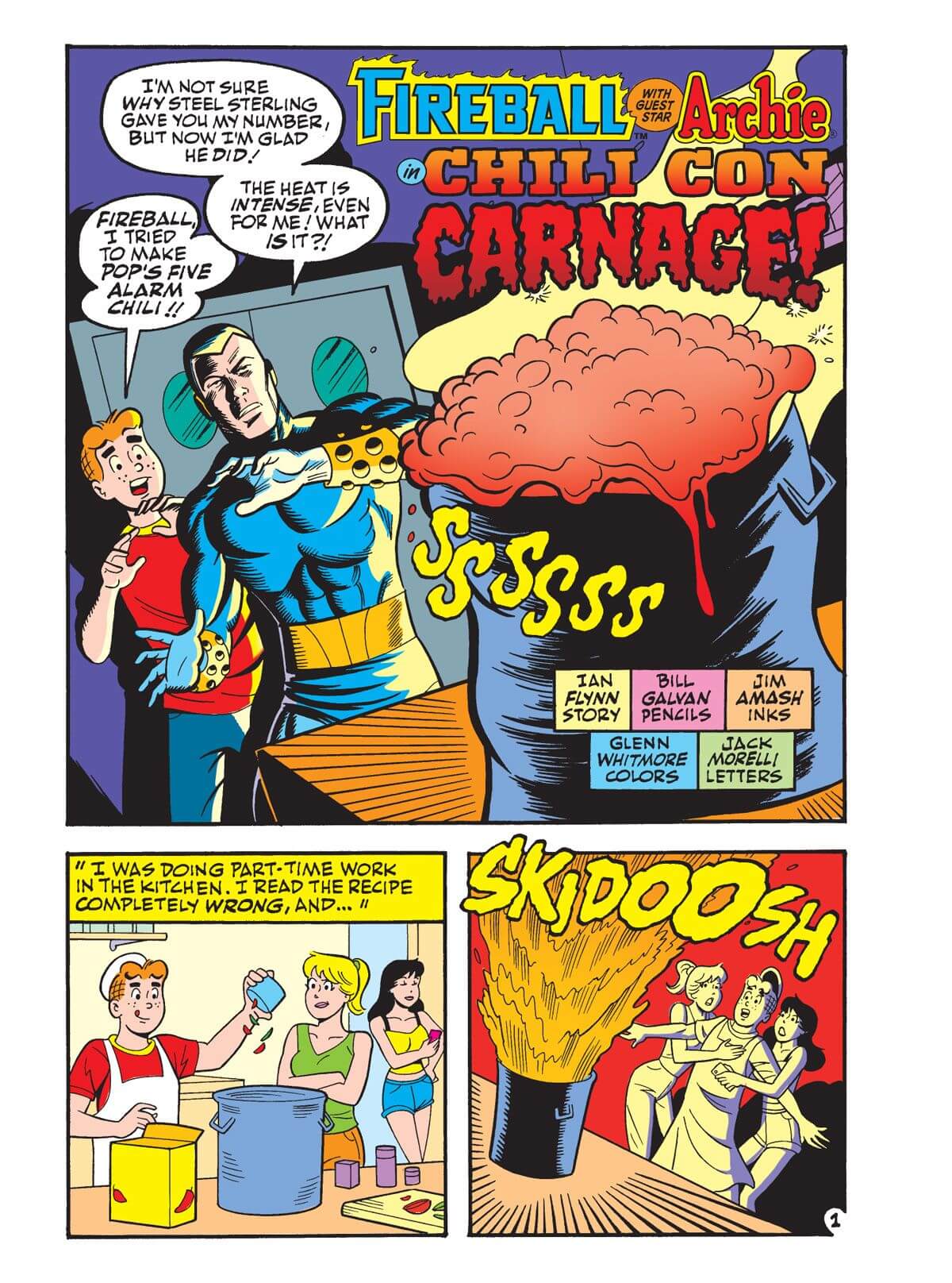 The second new tale features a visit from superhero Fireball. In Chili Con Carnage, Archie and Fireball team up to keep Pop’s from being destroyed by a mutant pan of chili!