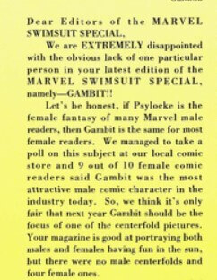 Wendy: It tells me that we must once again demand that Marvel bring back swimsuit issues. Fans of Gambit — and Nightcrawler — demand it.