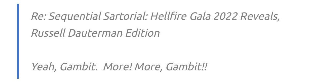 This special edition of the column is dedicated to editor Kayleigh Hearn’s mom in honor of her reaction to Gambit’s 2022 Hellfire Gala look:
