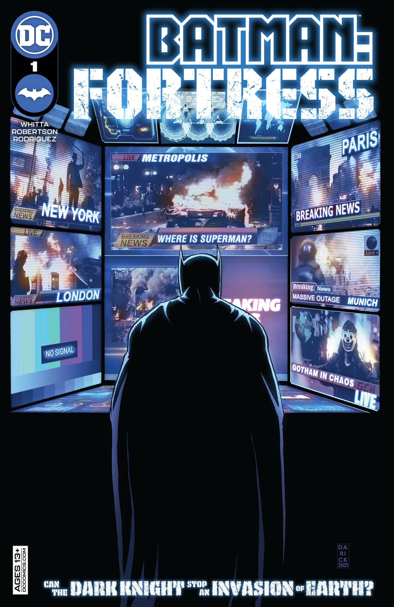 Simon Bowland (letters), Darick Robertson (art and cover), Diego Rodriguez (color and cover), Gary Whitta (writer)Batman looking at screens of catastrophe across the globe