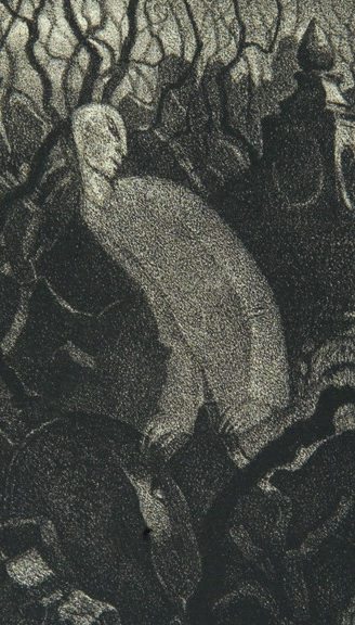 As noted earlier, Meyrink’s novel Der Golem was successfully adapted for film. But the novel’s illustrations by artist Hugo Steiner-Prag have little bearing on the stocky, lumbering figure shown onscreen. Instead, the Golem was depicted as an eerie, ghost-like entity, bald-headed and formed like the play of shadow and light.