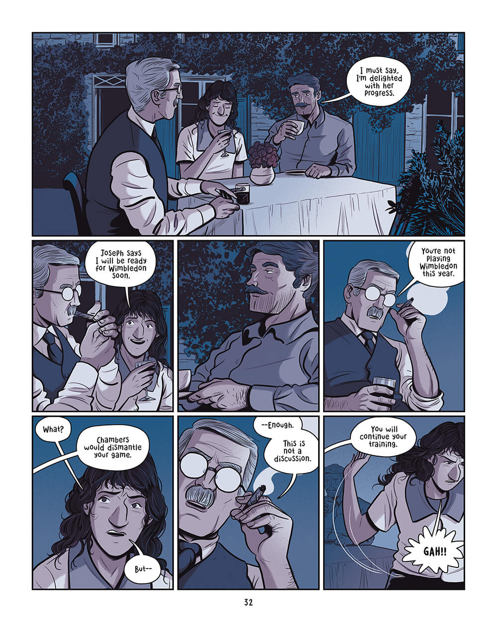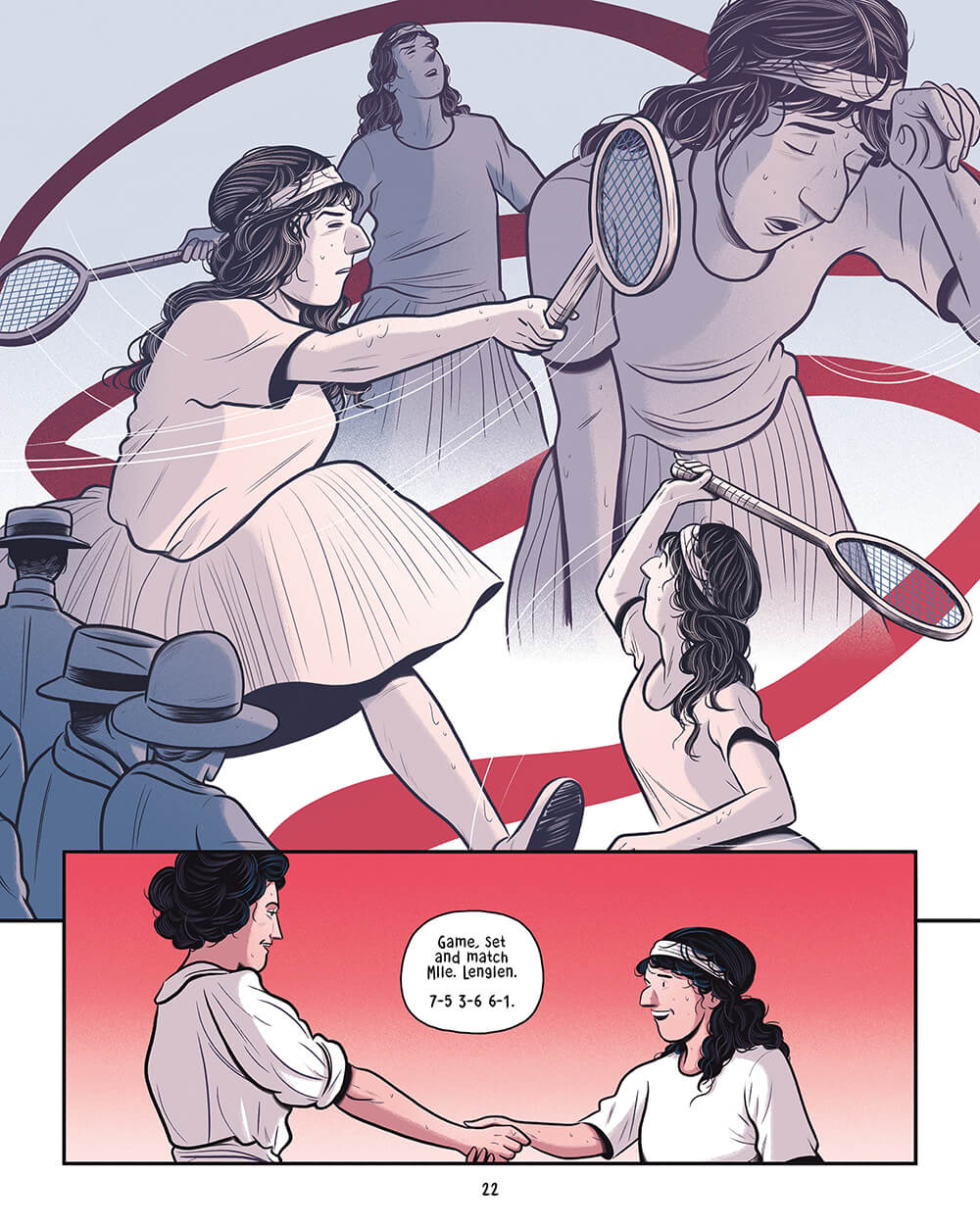 “Nothing about her style of play or her personality was dry,” says Humberstone about why he felt that a graphic novel best represented this vibrant figure. “It was important to me that Suzanne’s story wasn’t relayed in the dry prose of a tennis textbook or in stuttering archival footage. I wanted to create a comic that captured the vibrancy of the sport, her style, and the time she lived in.”