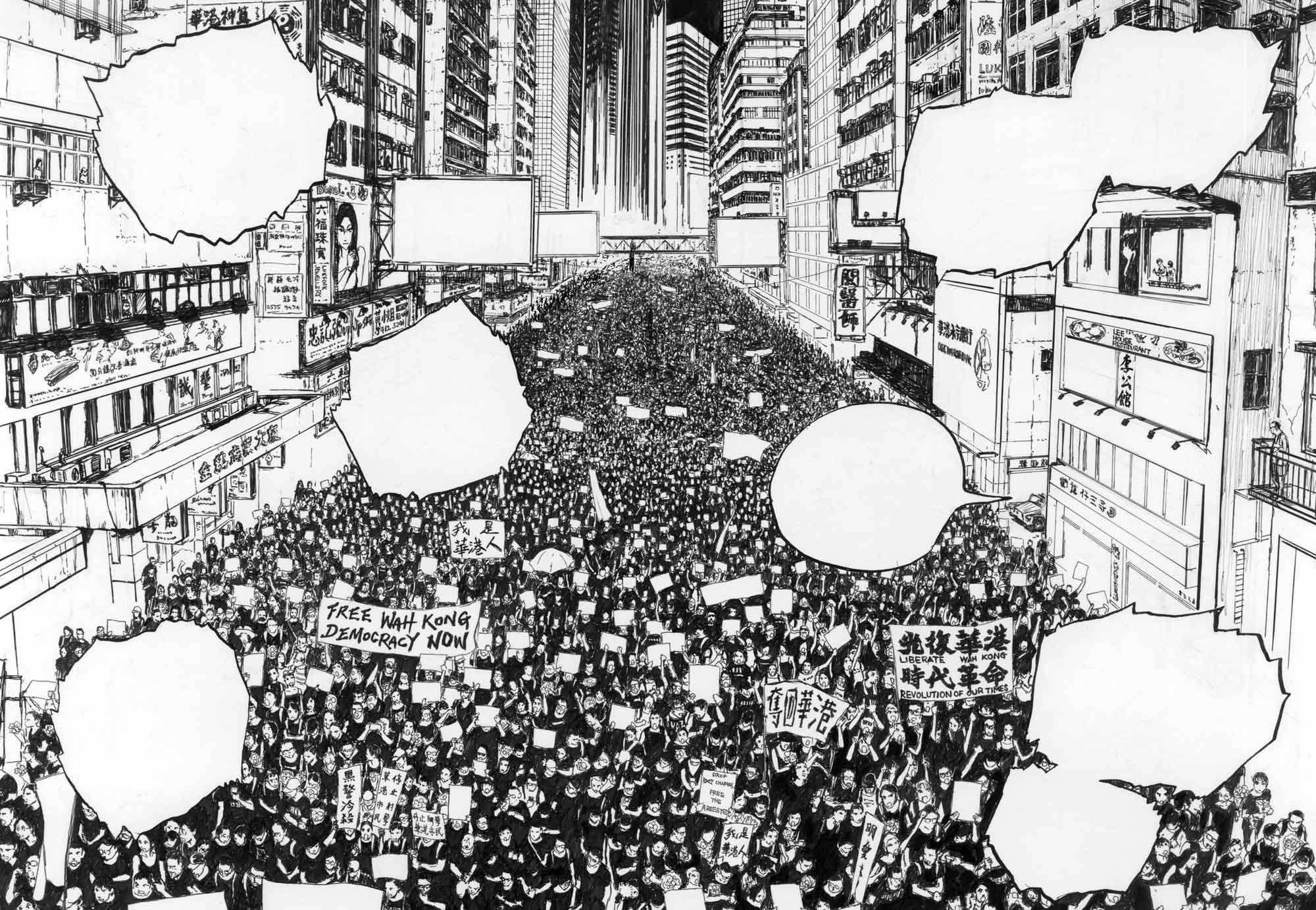 “I’m actually working on Ryuko Volume 3. Ryuko is back! Originally I was thinking of finishing Ryuko with Volume 2 but […] there are some complex and difficult situations in Hong Kong, and the students are fiercely fighting against the government for their democracy. I’m not drawing for my friends there – but as I said I have the spirit of [The Clash musician] Joe Strummer […] I thought I should really write and draw about the situation there.”