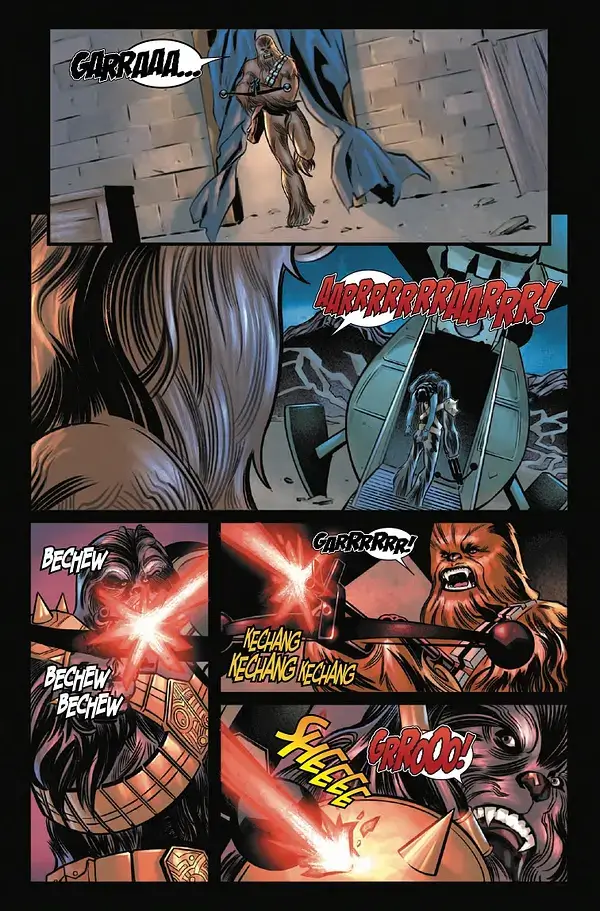 Han Solo & Chewbacca #4 is all Chewie, all the time. If you’ve ever seen The Star Wars Holiday Special and spent a full five minutes listening to Wookiees howl and moan at one another, this might seem like a nightmare. But thanks to some particularly compelling lettering from VC’s Joe Caramagna, being alone with Chewbacca as he tries to get his best friend back isn’t the worst experience imaginable.