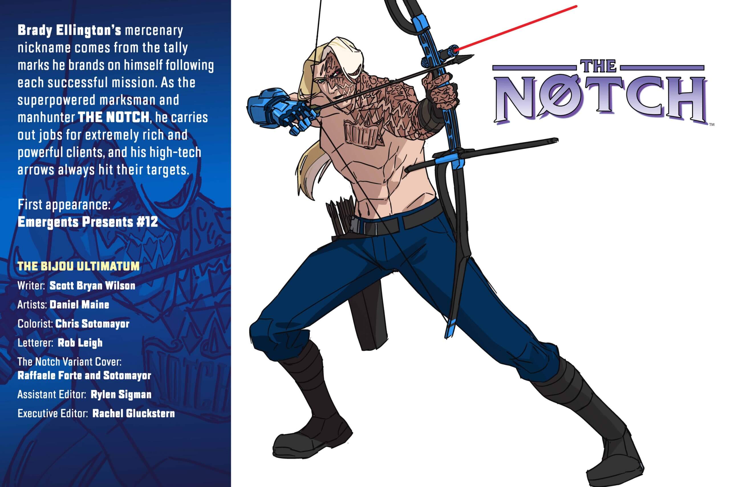 InterPop Comics prides itself on letting readers shape the Emergent Presents series, inviting voters to choose which three characters return for additional short stories. In Emergents Presents #12, the anthology is once again spotlighting its newest creations, namely, Bookworm, The Notch, and Makeshift. With digital copies on sale now, you can check out this preview of Emergents Presents #12, featuring mercenary marksman, The Notch.