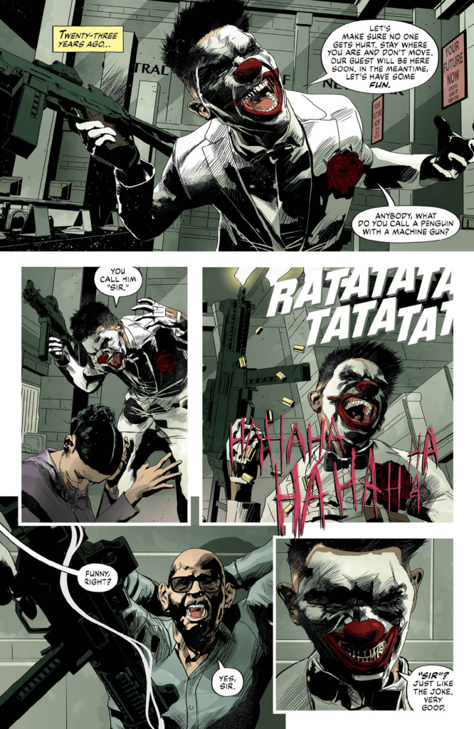 The point is, Cloaked is not subtle about what it’s trying to do. As Stevens tracks down the clues to the Sentinel’s (or the Reaper’s?) disappearance, a slew of grisly murders follows him. First, Dicky Johnson is shot outside a bar after Stevens interviews the man, then a reporter who used to cover the crimefighting duo is thrown out of a high-rise apartment window. Finally, the clown-themed nemesis himself, a former accountant subjected to regular shock treatment in a mental institution, is found hanged in his cell.