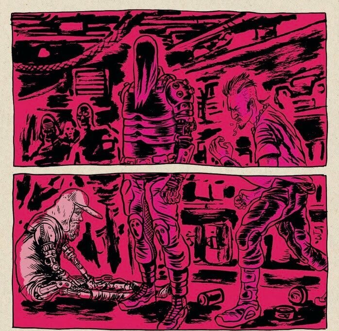 Ziritt’s art here is really something to behold. The entire book is full of memorable character designs, individuals heavily augmented by cybernetics that aren’t clean or sleek, but grimy and chunky, with visible servos, cables and toggles. Every aspect of the book looks like it smells of diesel fuel, every environment feels like it’s thudding with synthwave beats. Colors are vibrant and blocky; entire pages done in red on black inks, with only a small burst of yellow to denote a visual effect. More than just evocative of some of cyberpunk’s best tropes, Ziritt’s world here feels lived in.